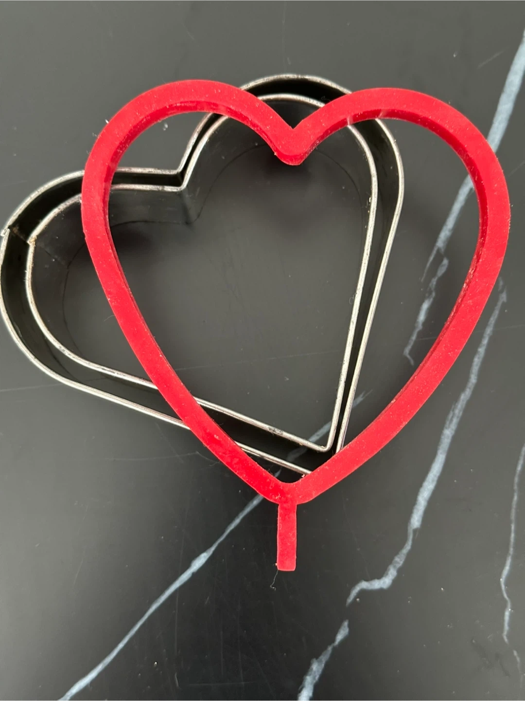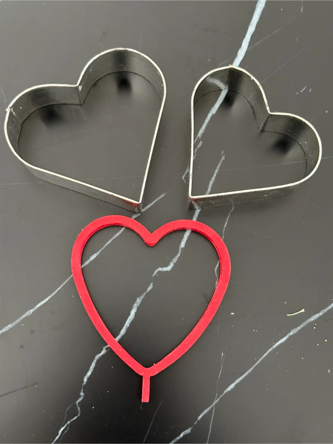 Two are stainless steel cookie cutters , and one is a red plastic silicone pancake mold. About 4” wide. Perfect for Valentine’s Day