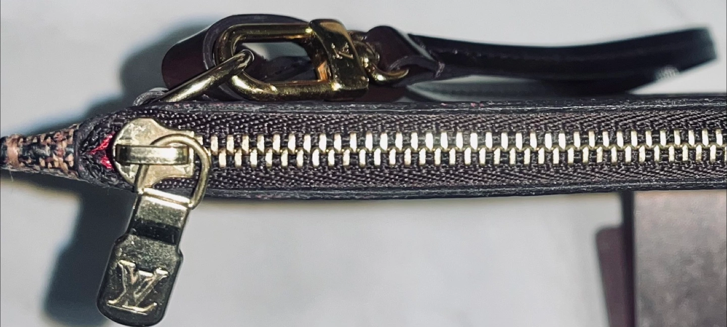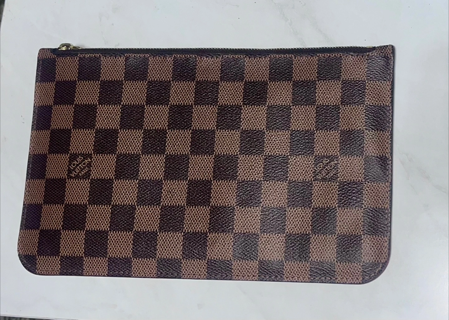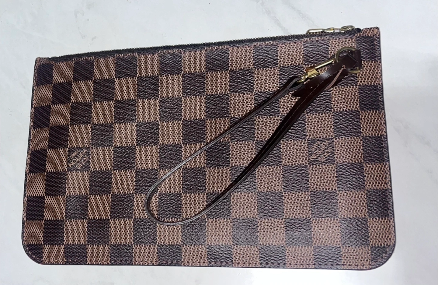 Selling a Louis Vuitton Damier Ebene Pochette. It features the classic brown checkered pattern. The interior is a vibrant red colour. It's in great condition!