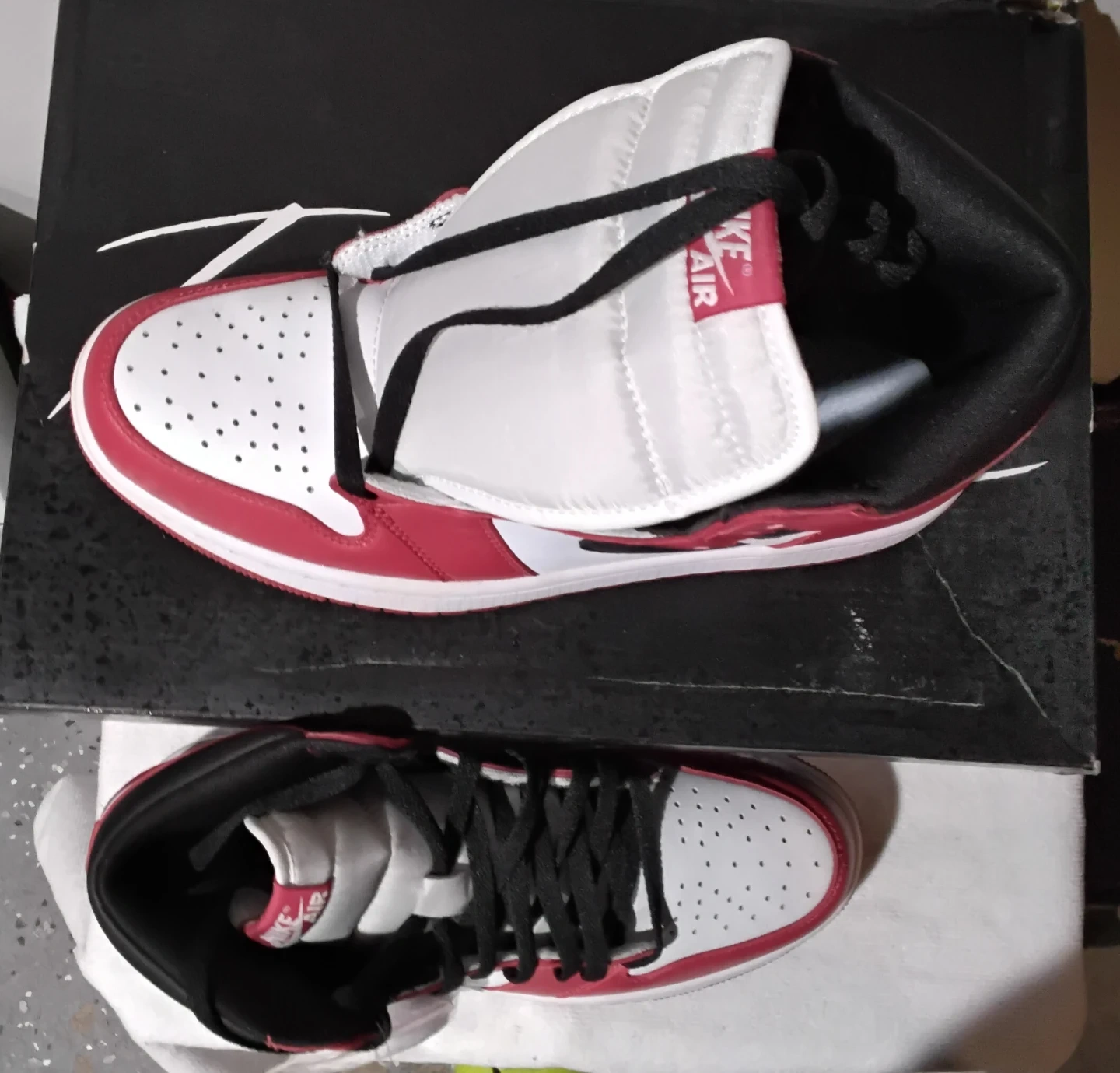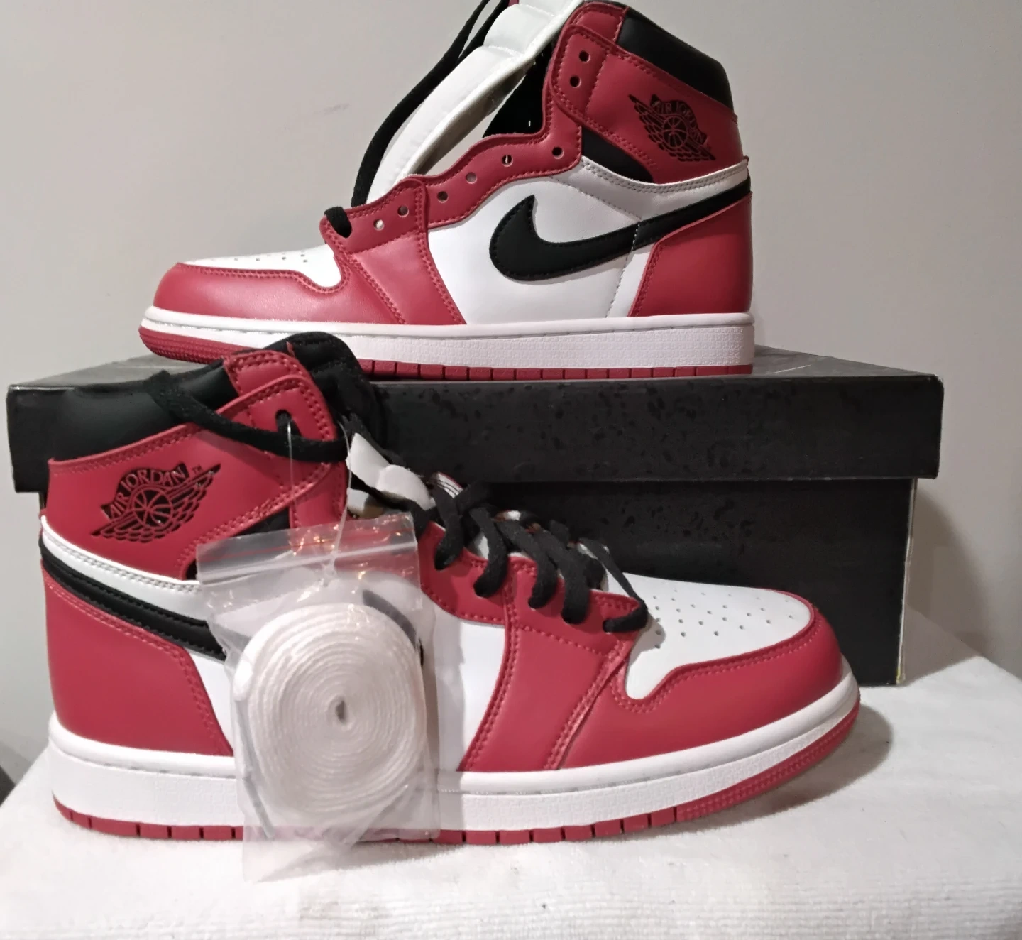 Red and white Air Jordan 1 Retro High OG Chicago sneakers. Includes original box and extra white laces. A classic high-top silhouette.