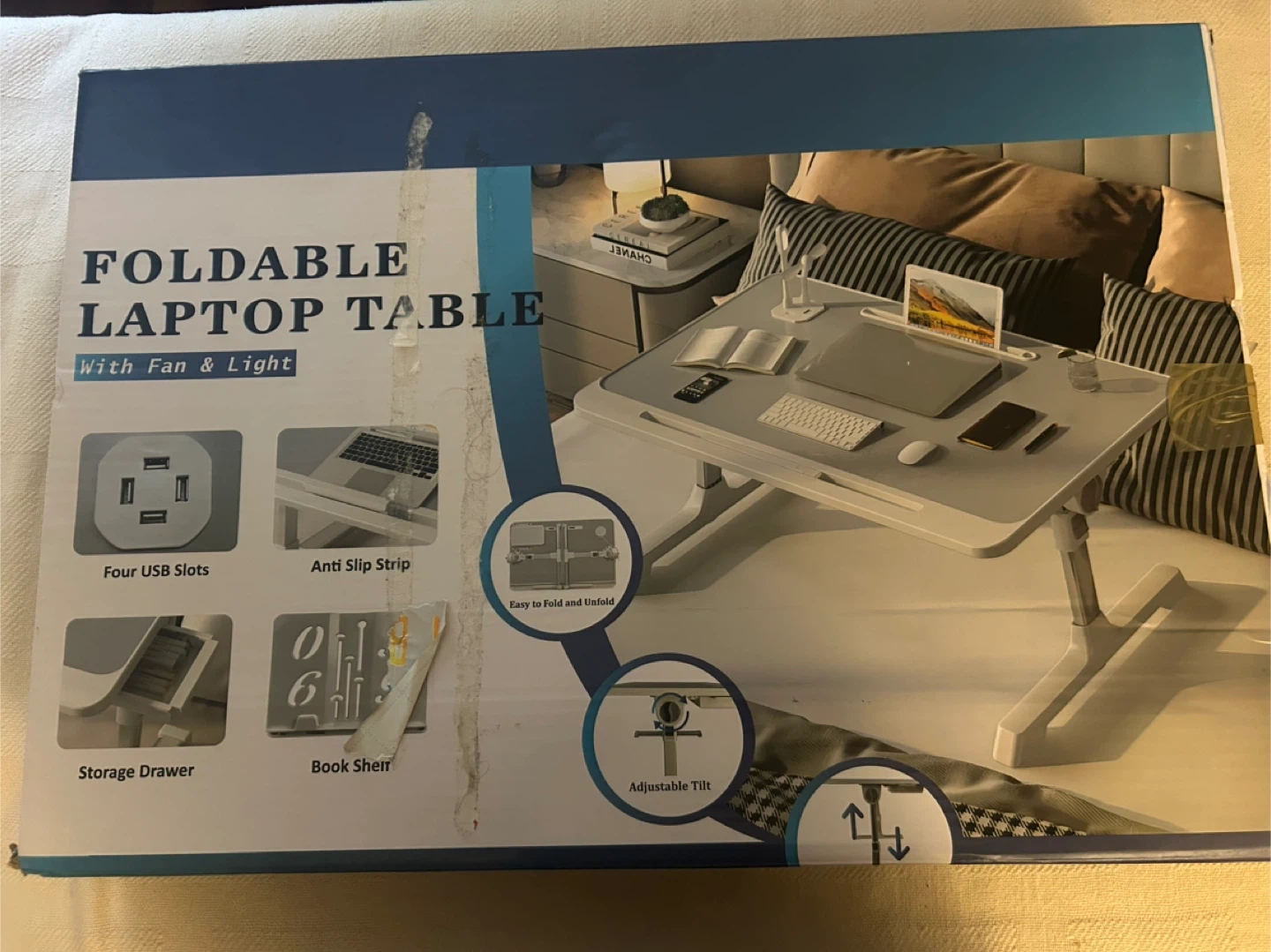 Selling a foldable laptop table that comes with a fan and light! It features four USB slots, an anti-slip strip, and a storage drawer. It's easy to fold and unfold, and it has an adjustable tilt! Perfect for working from the comfort of your bed or couch
