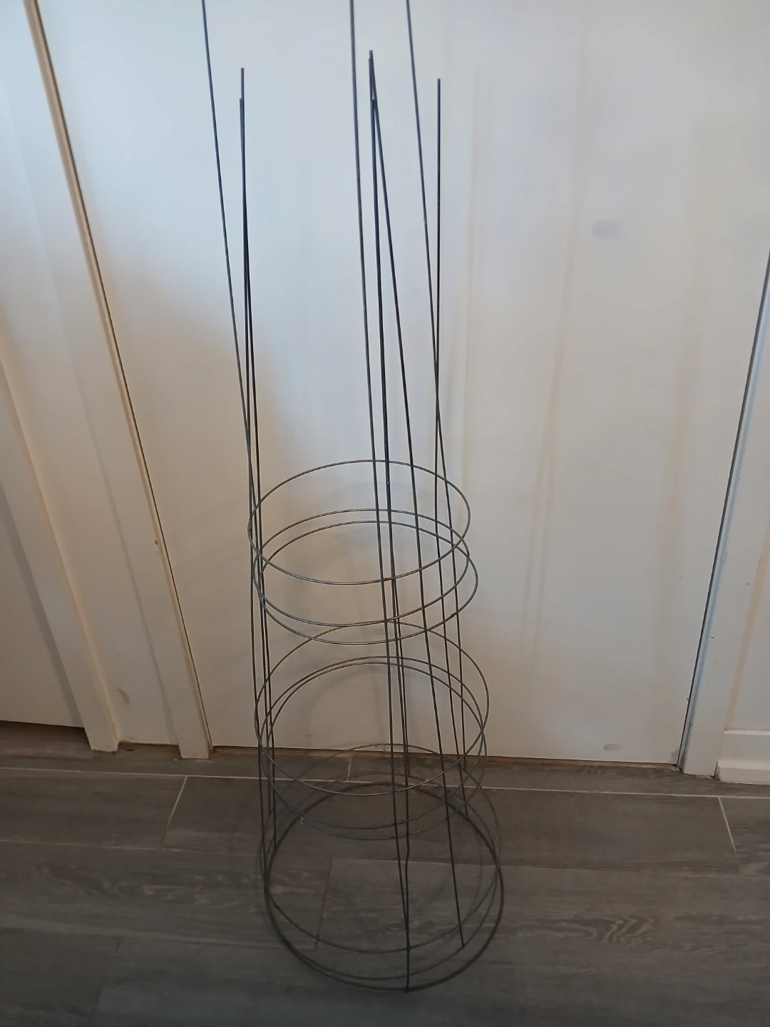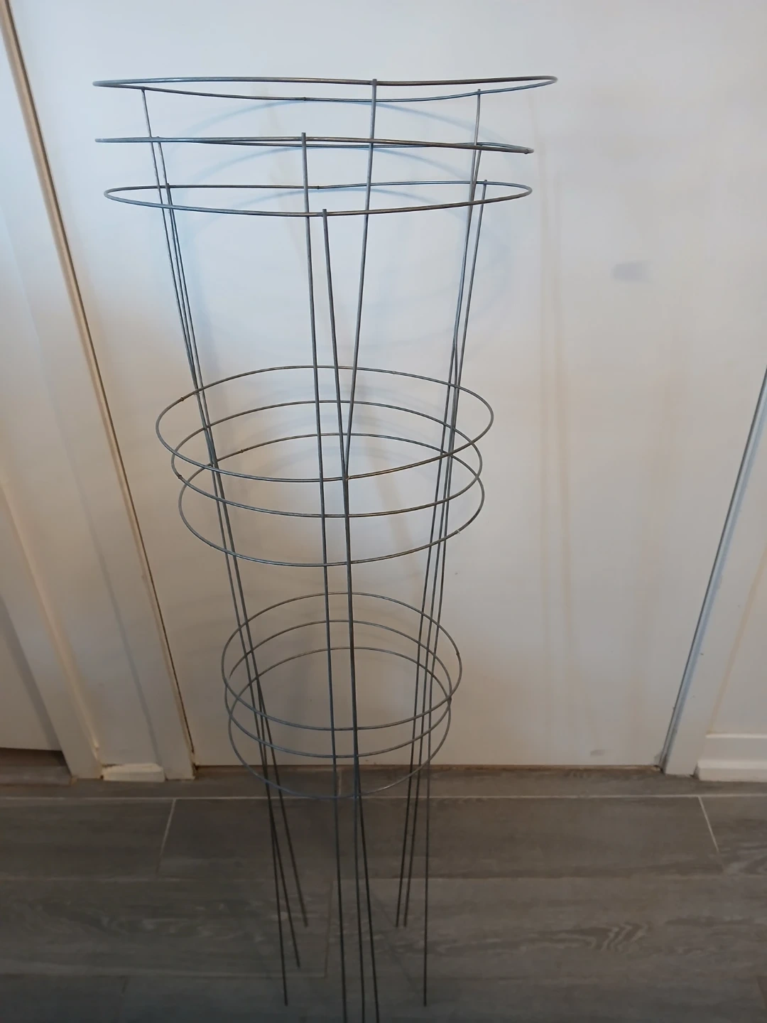 Wire plant support cage for tomatoes or other vining plants. It's made of durable metal and stands tall to help your plants grow upwards. Use it to keep your garden tidy and plants healthy!