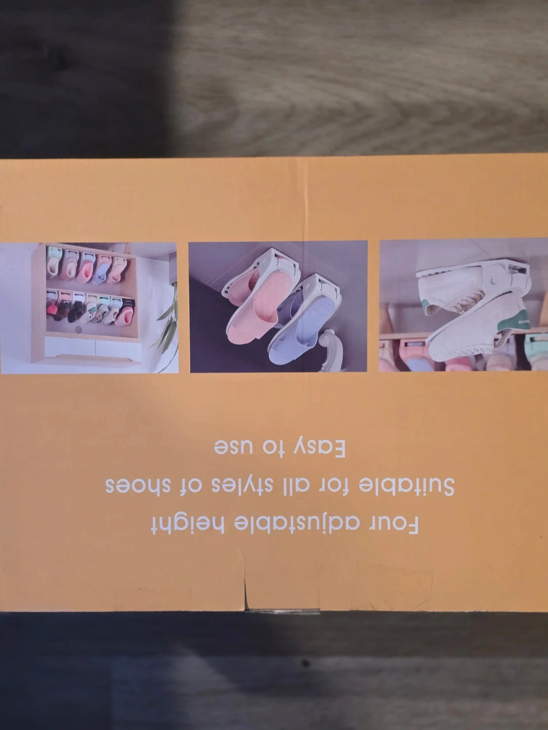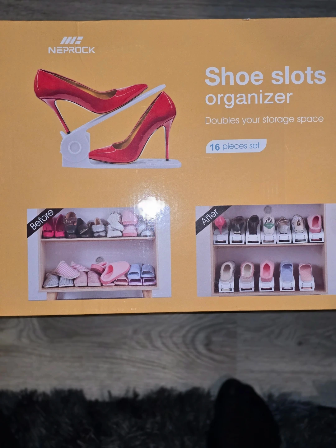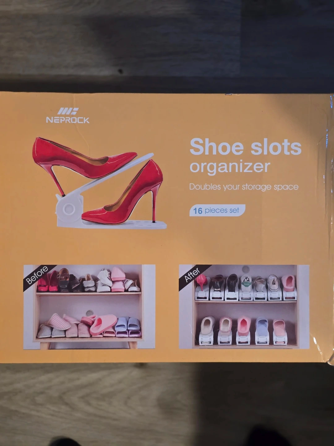 This is a 16-piece set of shoe slots organizers. They double your storage space and are suitable for all styles of shoes. Features four adjustable height settings for easy use!