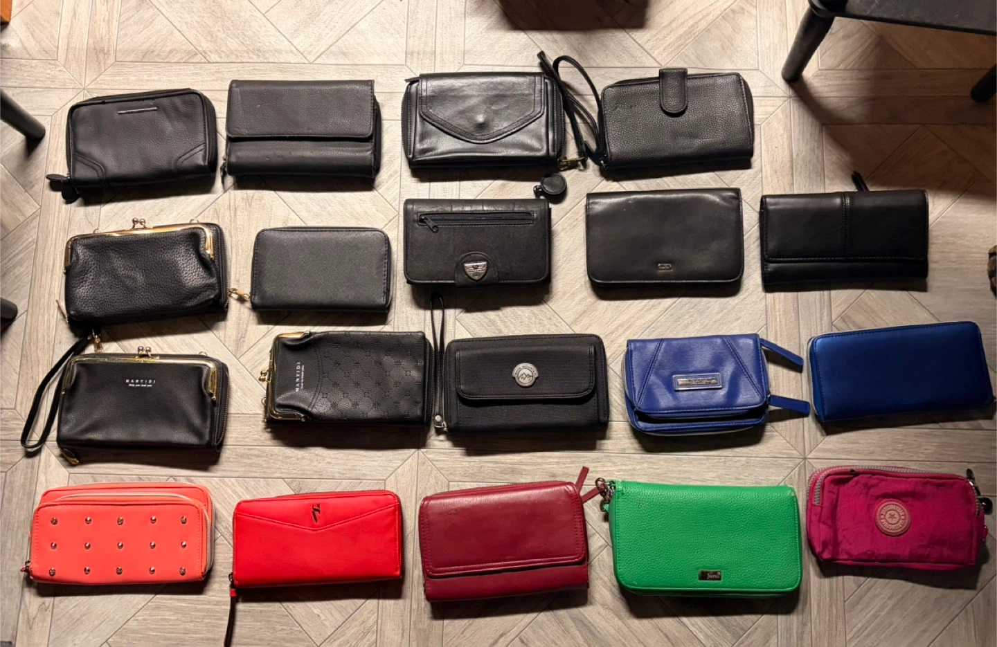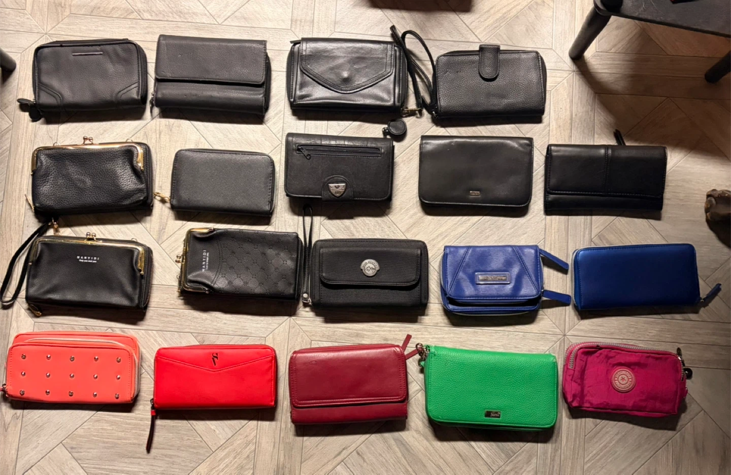 A collection of various women's wallets and clutches in different colors and materials. Includes zip-around styles, wristlets, and bifold designs. Perfect for organizing your essentials.