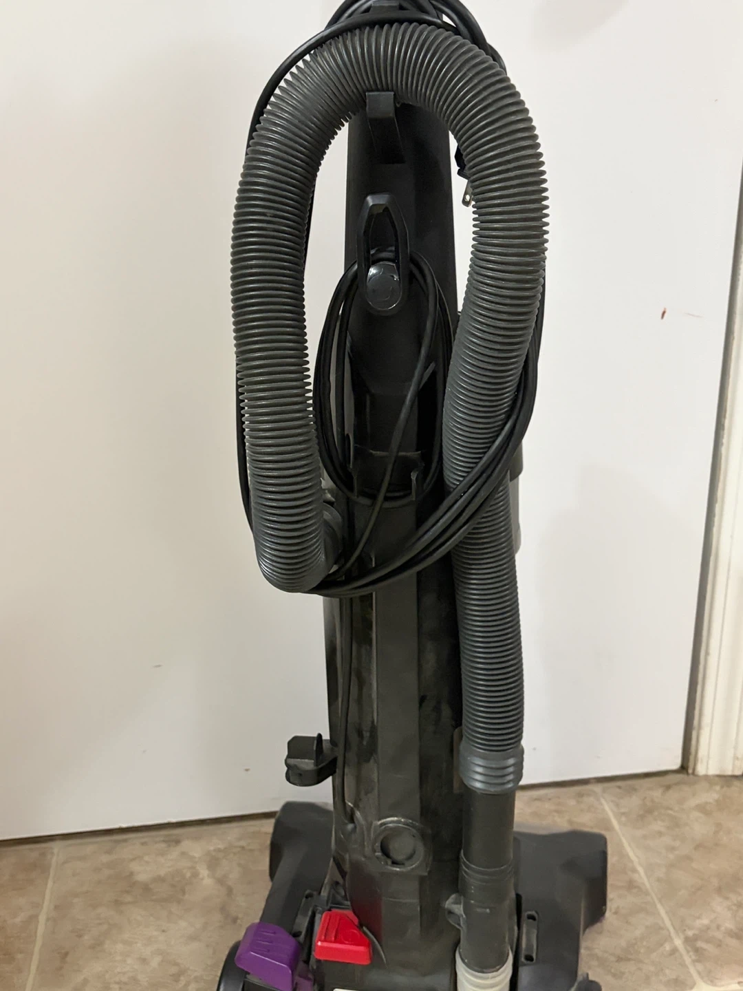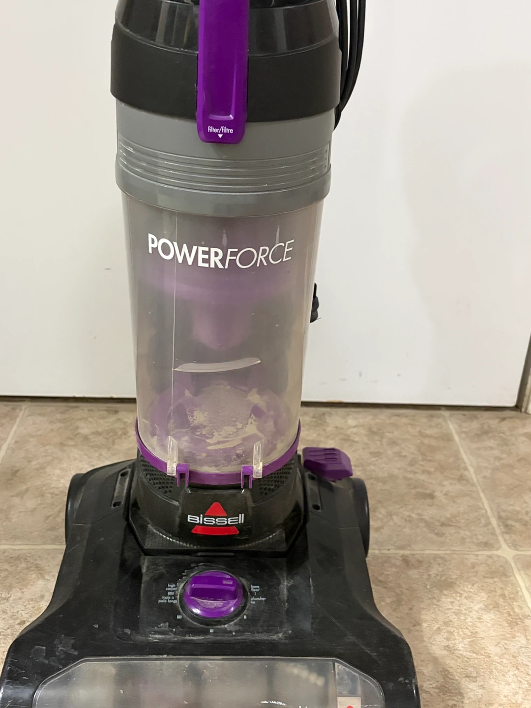 This is a Bissell PowerForce upright vacuum cleaner. It's a corded electric model with a purple and black design. The dustbin is clear so you can see when it's full.