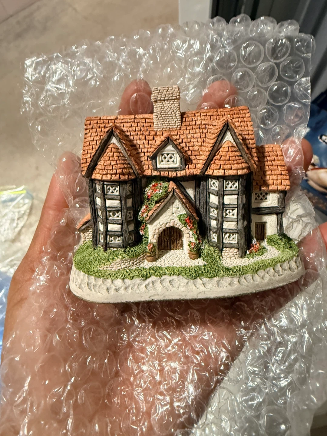 This is a Shirehall TM miniature house, handcrafted and hand-painted by David Winter. It was made in 1985 in the Studios & Workshops of John Hine Ltd. in Hampshire, Great Britain. This detailed piece showcases traditional Tudor-style architecture with a prominent chimney and intricate brickwork. It's a lovely collectible item for display.