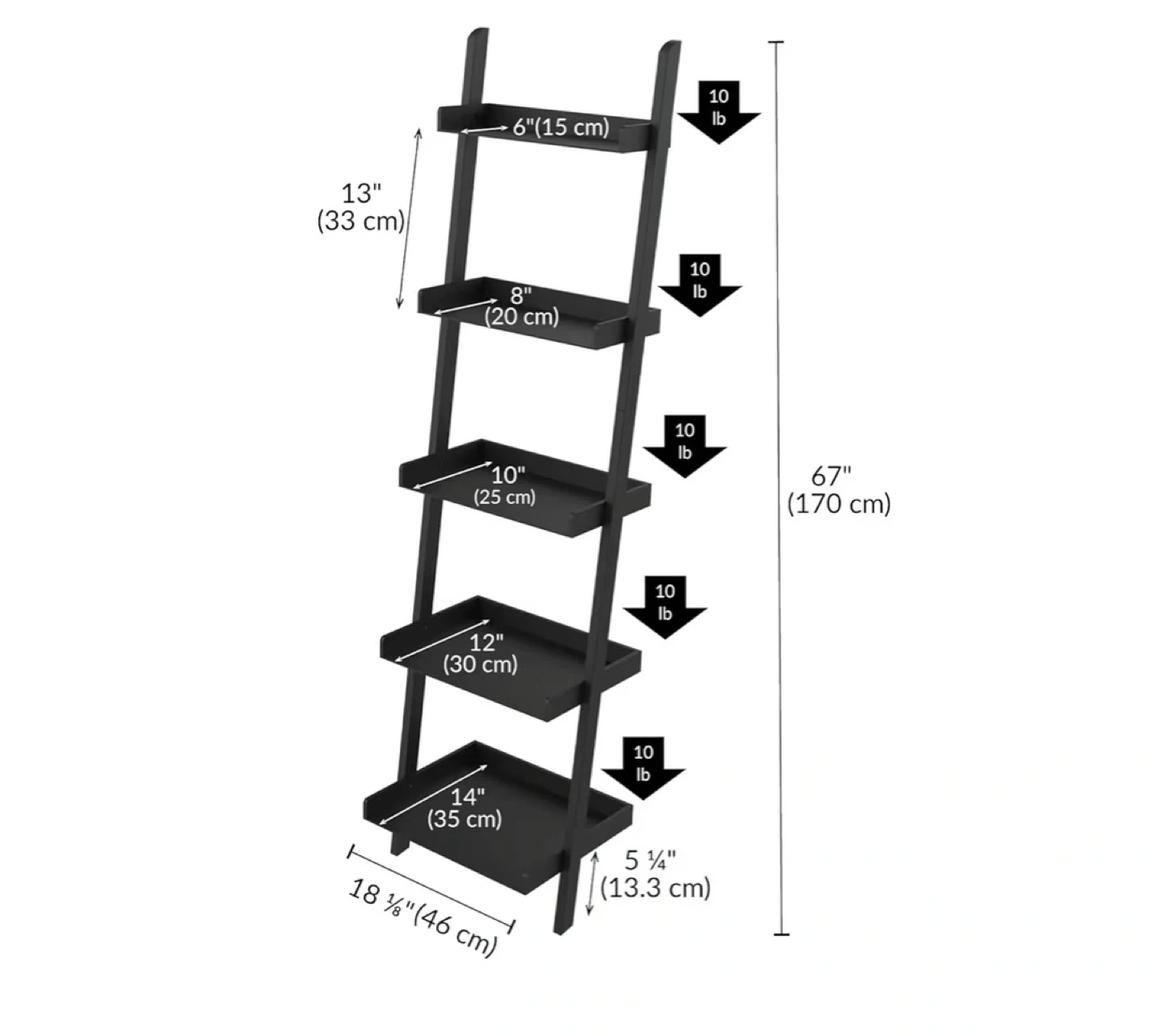 - Shelf depths: Vary from 6 inches (15 cm) at the top to 14 inches (35 cm) at the bottom.