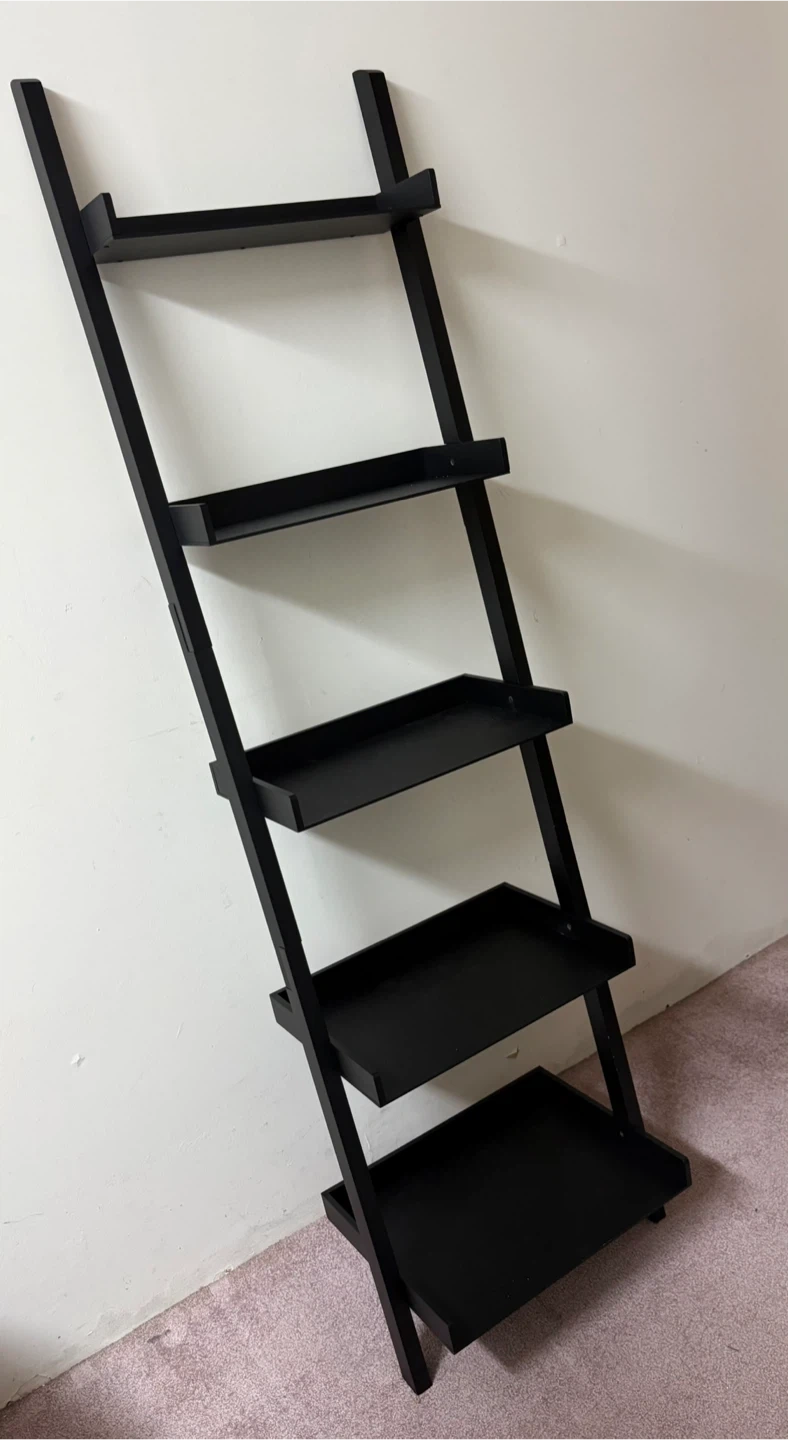 Selling a stylish black 5-tier ladder shelf! It's brand new and ready to add some vertical storage to your space.