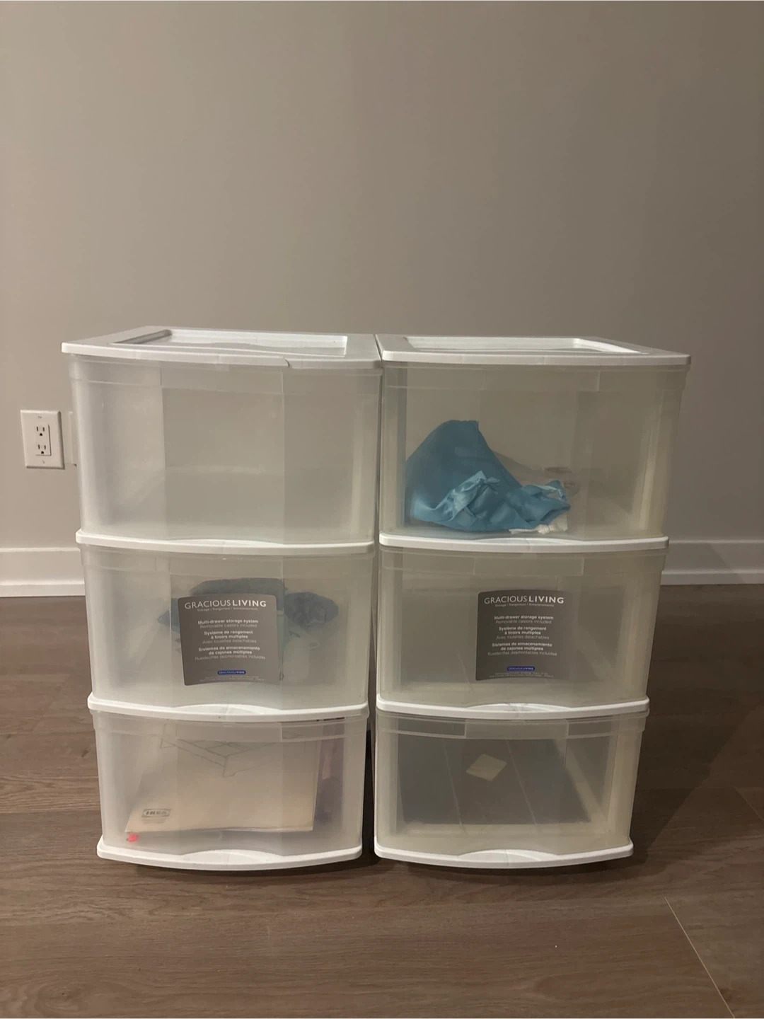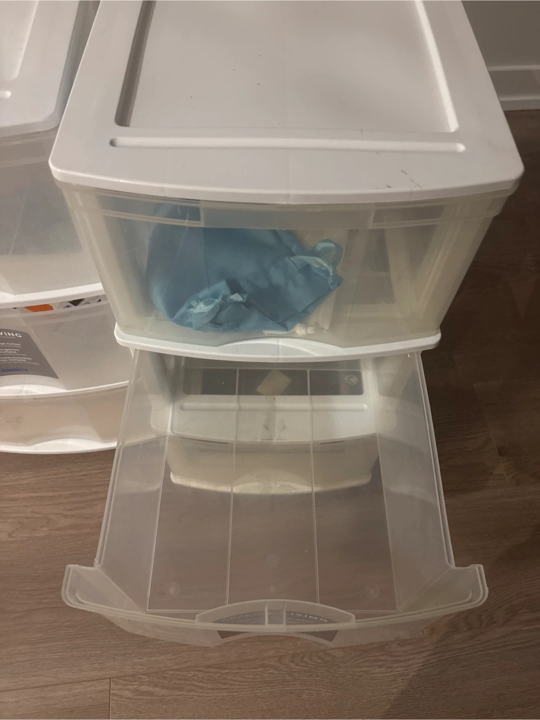 White plastic storage unit with 6 clear drawers. Comes with wheels for easy mobility. A great way to organize your belongings! One of the unit has a little crack on top, otherwise in good condition.
