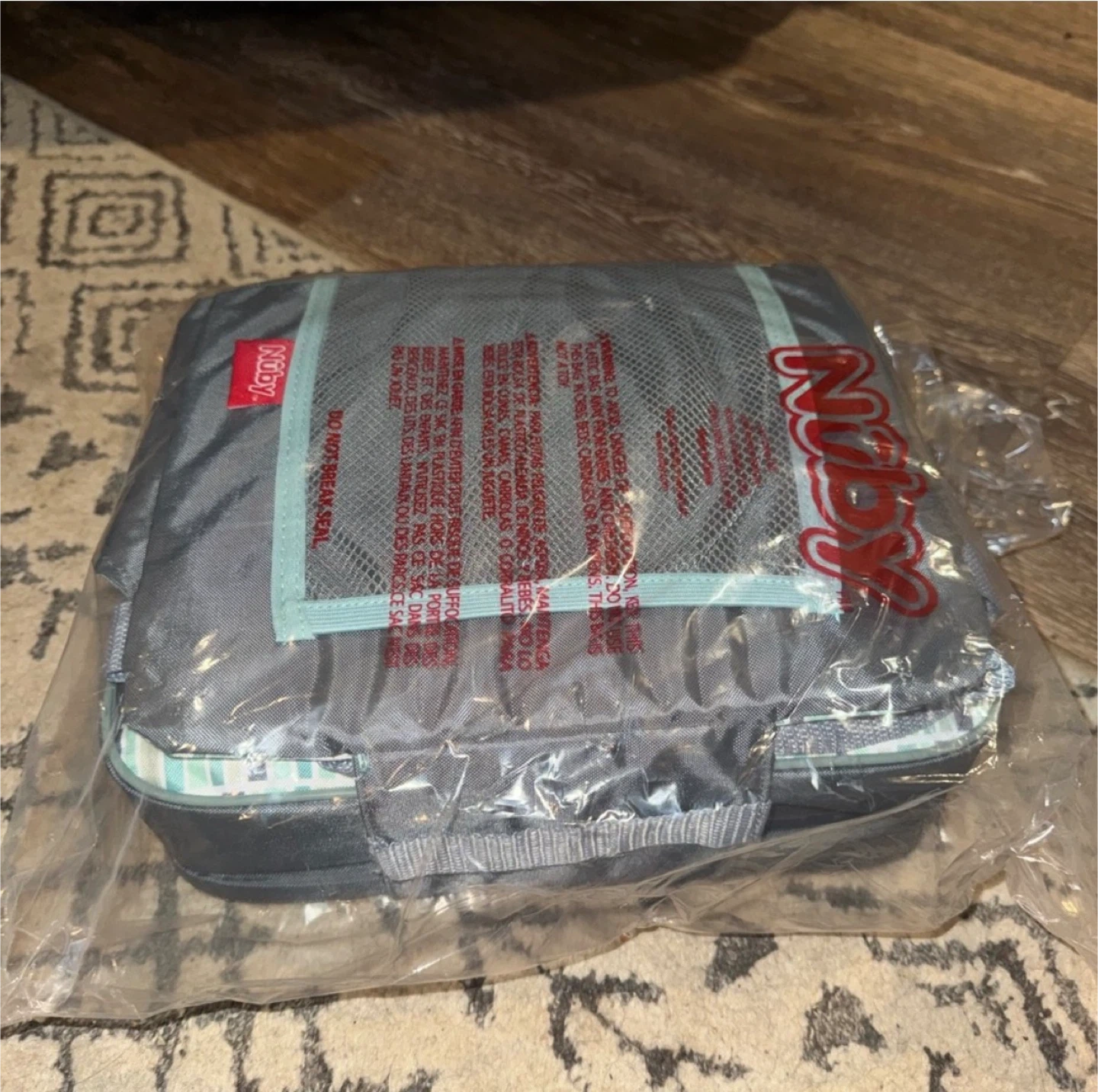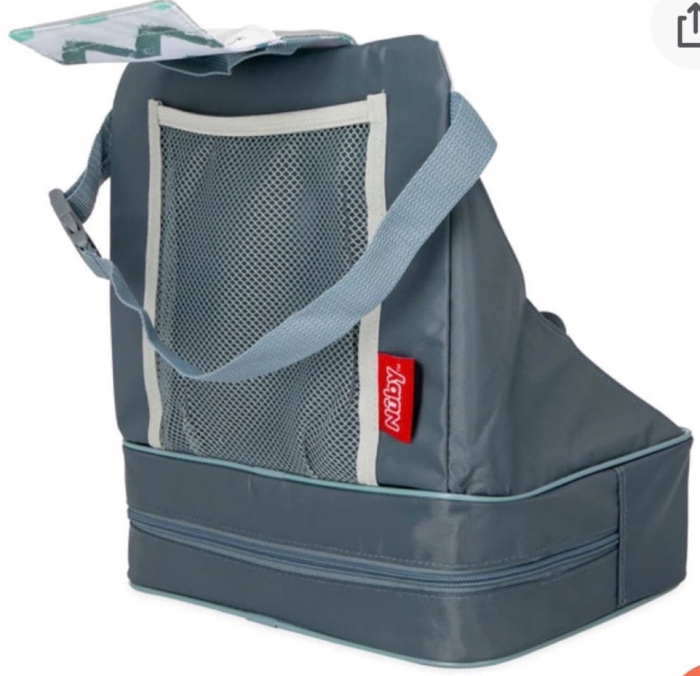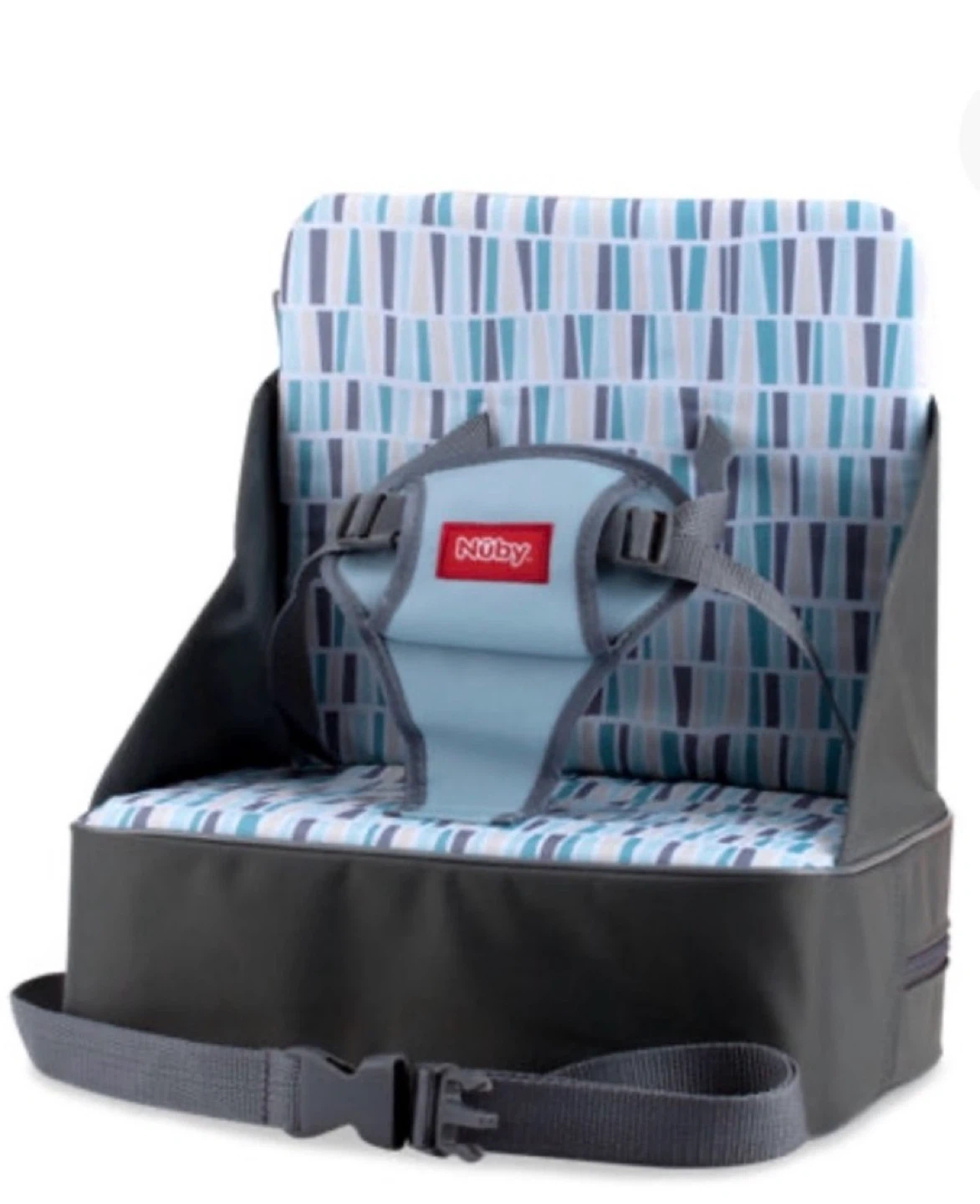 This is a Nuby booster seat with a grey and teal design. It features a 3-point safety harness and straps for securing to a chair. It's easy to clean and portable for on-the-go use.