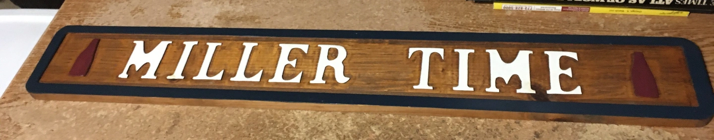 Rustic wooden sign. Features the words Miller Time in white lettering on a dark stained wood background. Dark blue border. Two small, dark red bottle images flank the words. good condition it's like 38 3/8" x 5 1/2" x 3/4". Cash only pick up at house
