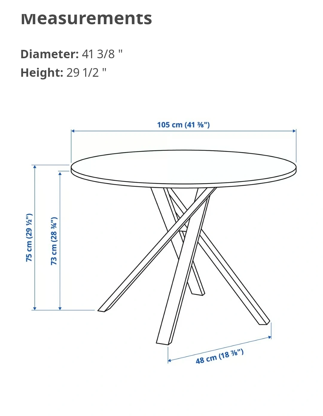 A clean white round dining table. It's 41 3/8" in diameter and 29 1/2" high. The table has a unique criss-cross leg design.