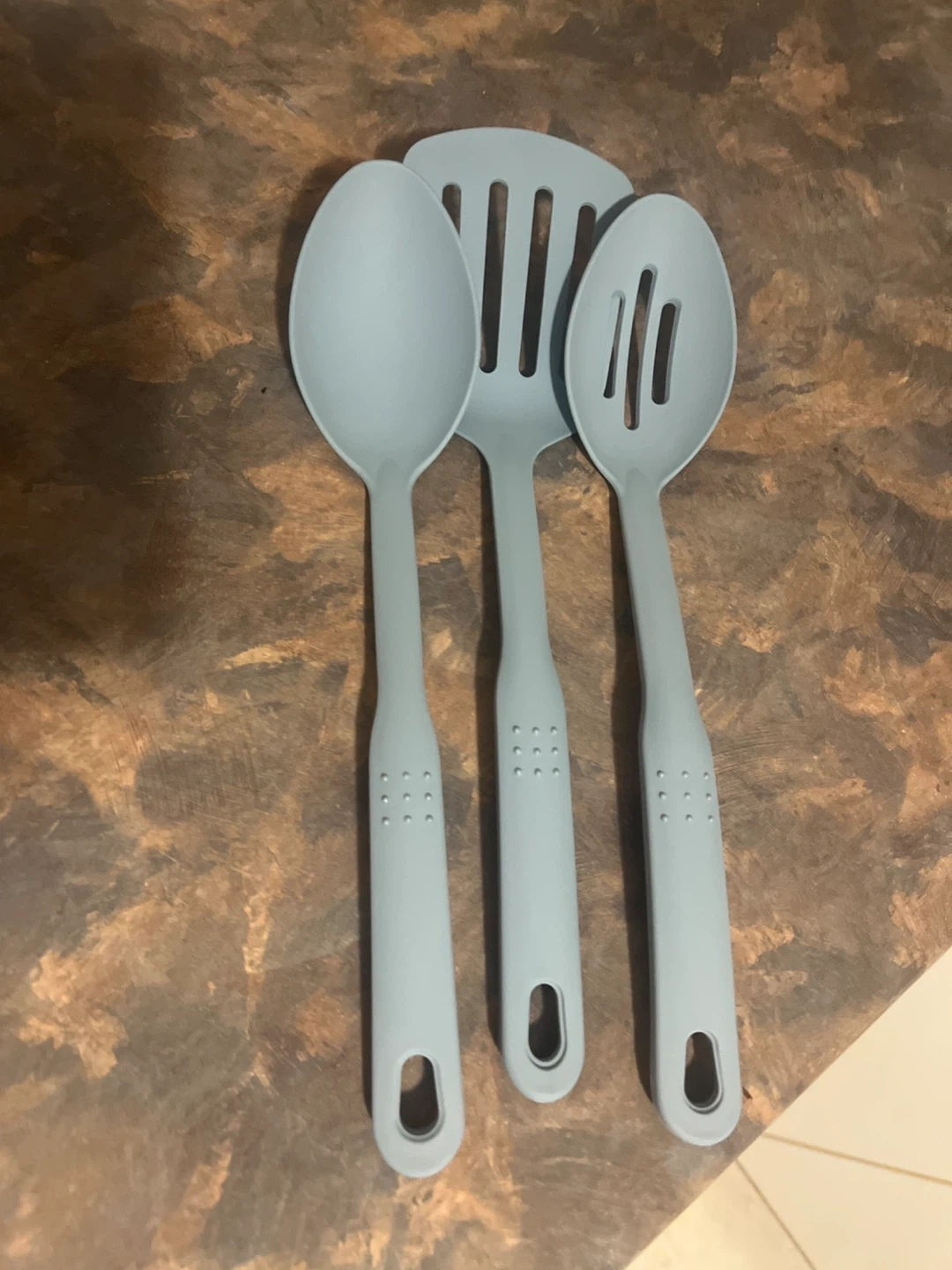 Never used- A set of three light grey plastic kitchen utensils, including a slotted spoon, a solid spoon, and a spatula.