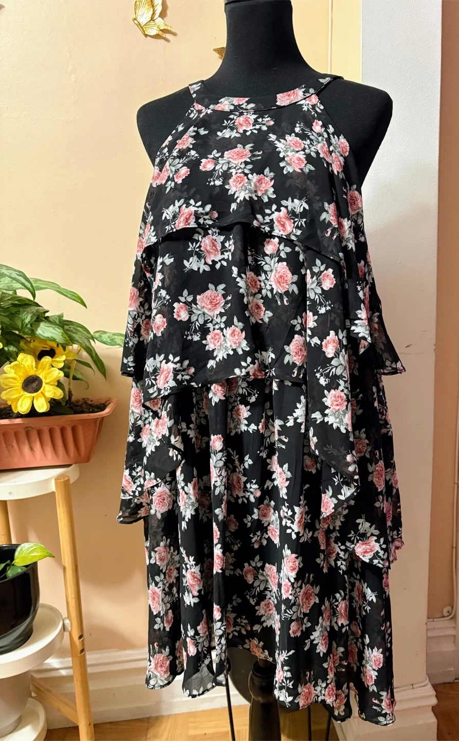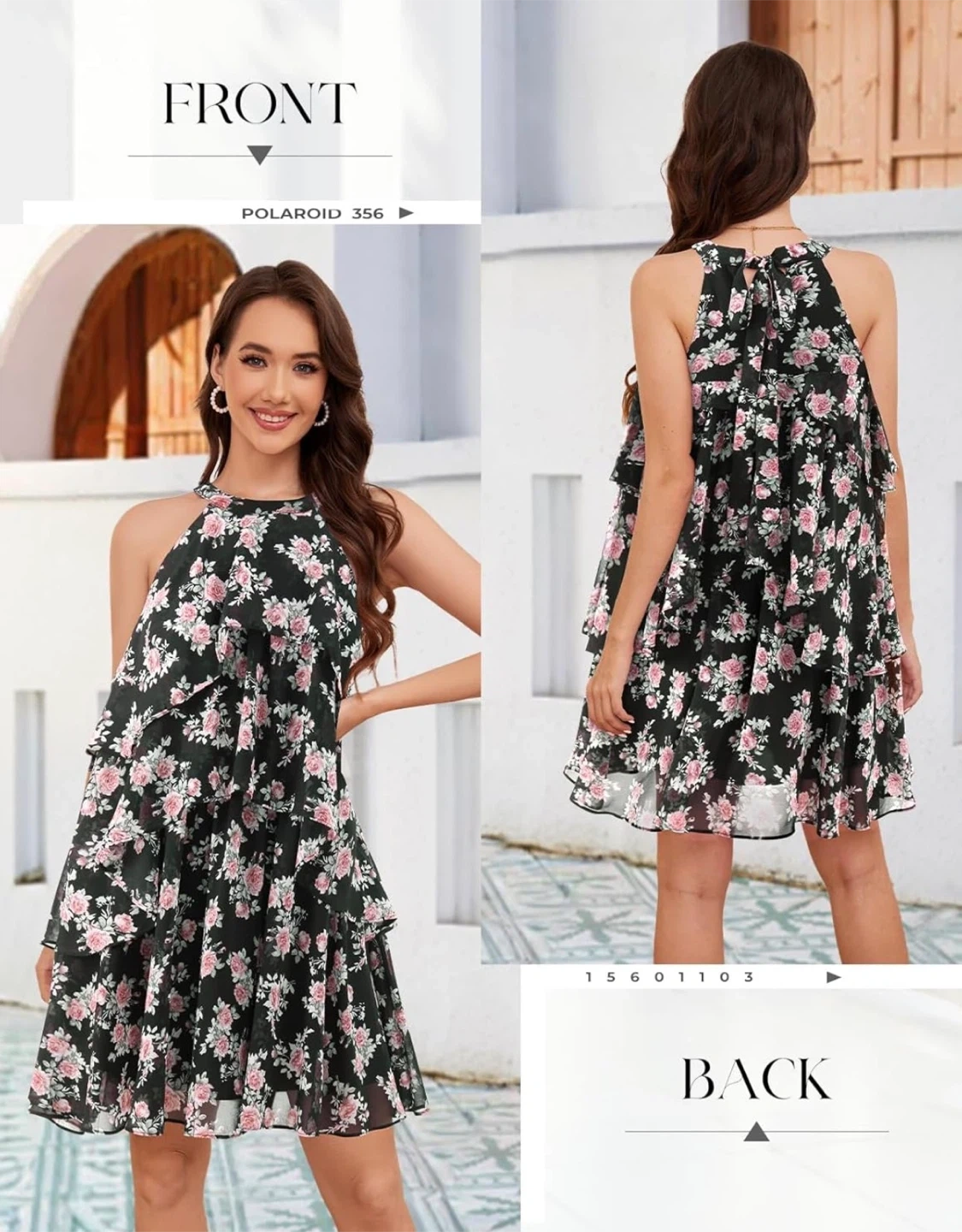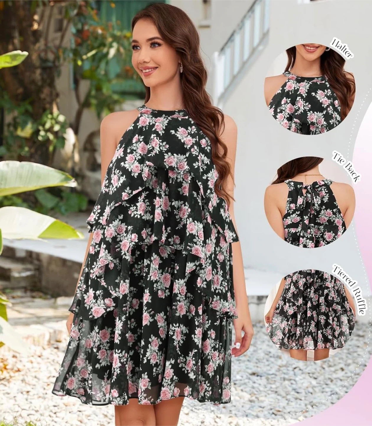 This is a DRESSTELLS floral print halter dress. It features a tiered ruffle design and a tie-back closure. The dress is made of lightweight fabric.