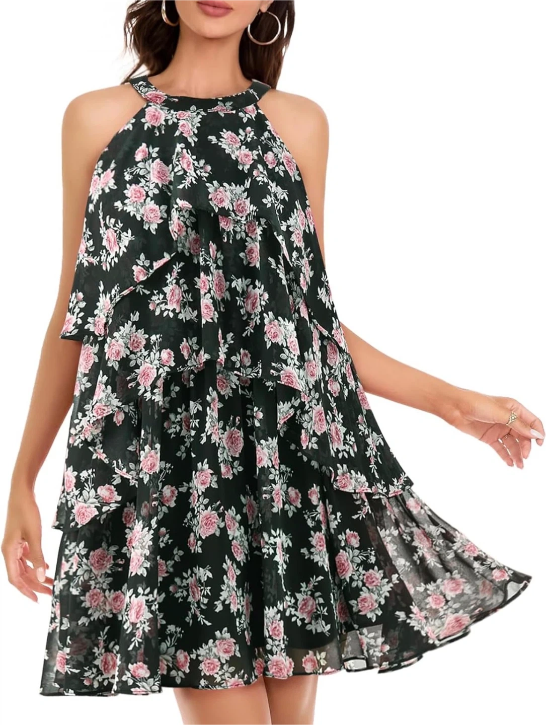 DRESSTELLS Floral Halter Tiered Ruffle Dress