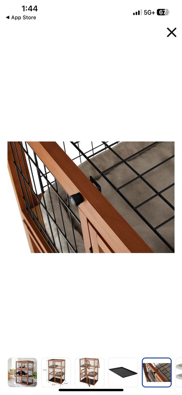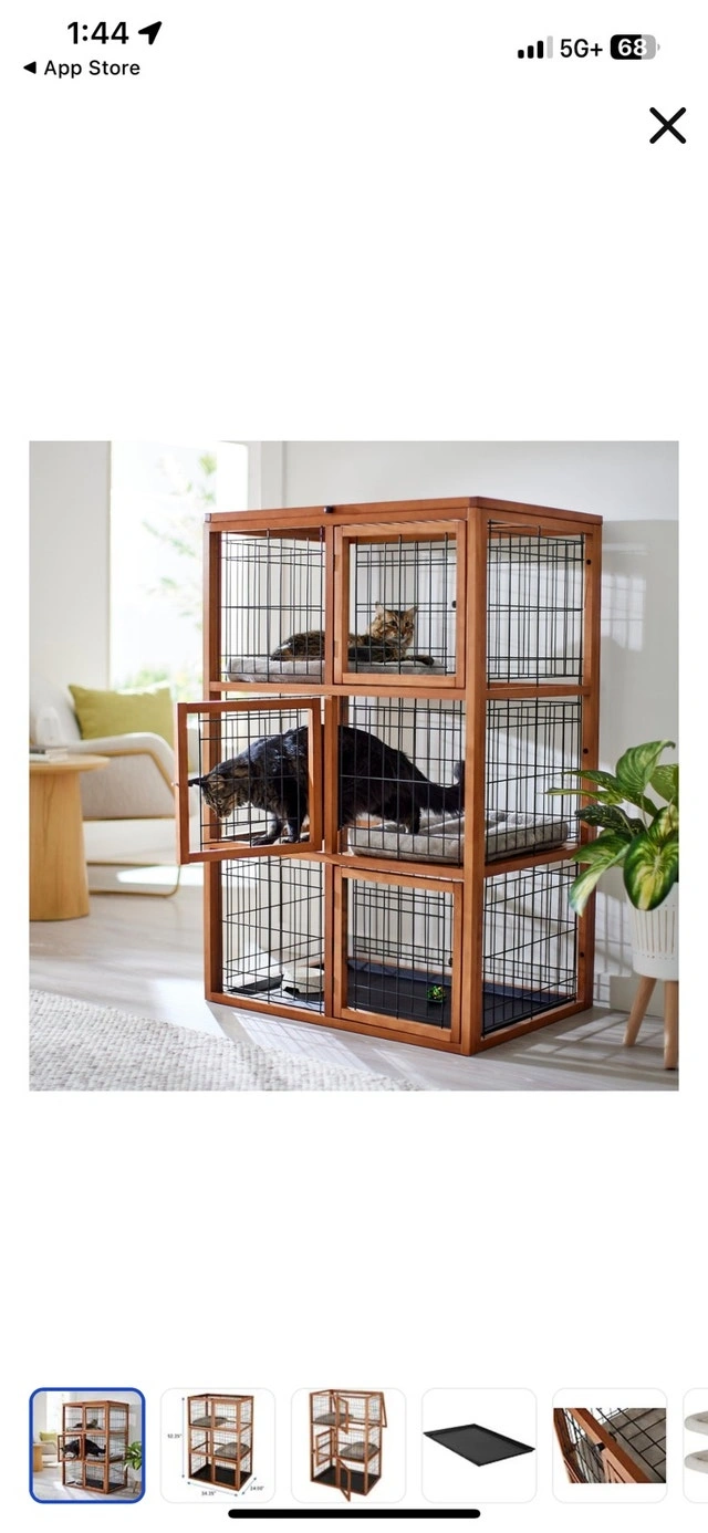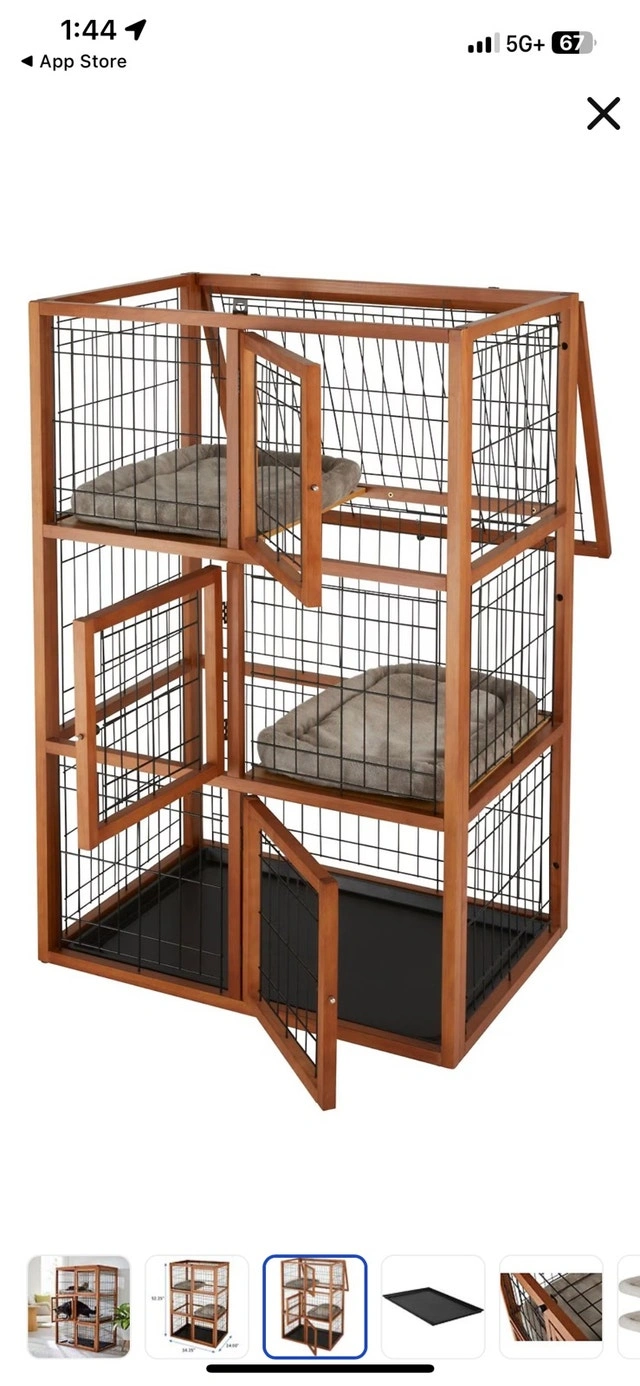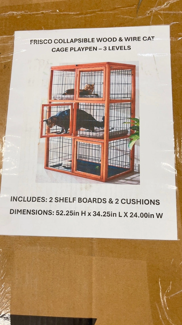 Selling a brand new Frisco 3-Story Wood & Wire Cat Cage Playpen. It provides a spacious and engaging environment for your feline friends with a sturdy wood frame and wire enclosures. Features multiple levels for climbing, playing, and resting, including two shelf boards and two cushions for comfort. Dimensions are 52.25" H x 34.25" L x 24" W. This cat playpen is perfect for giving your cats a fun and secure space – like their own condo! If the ad is up, it's available!