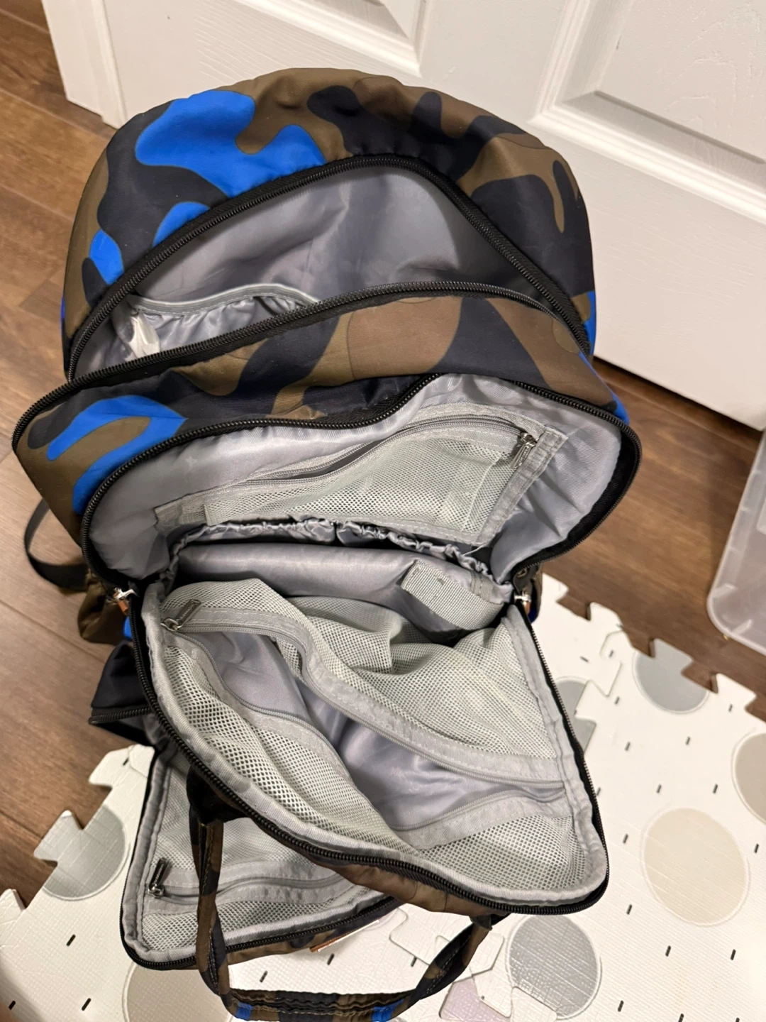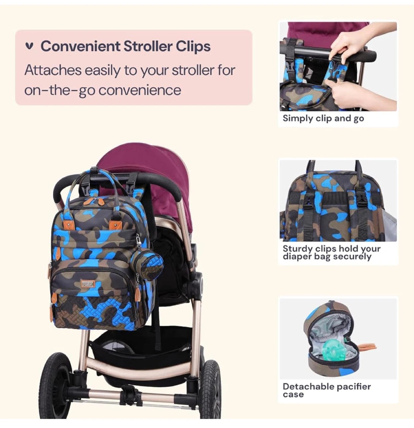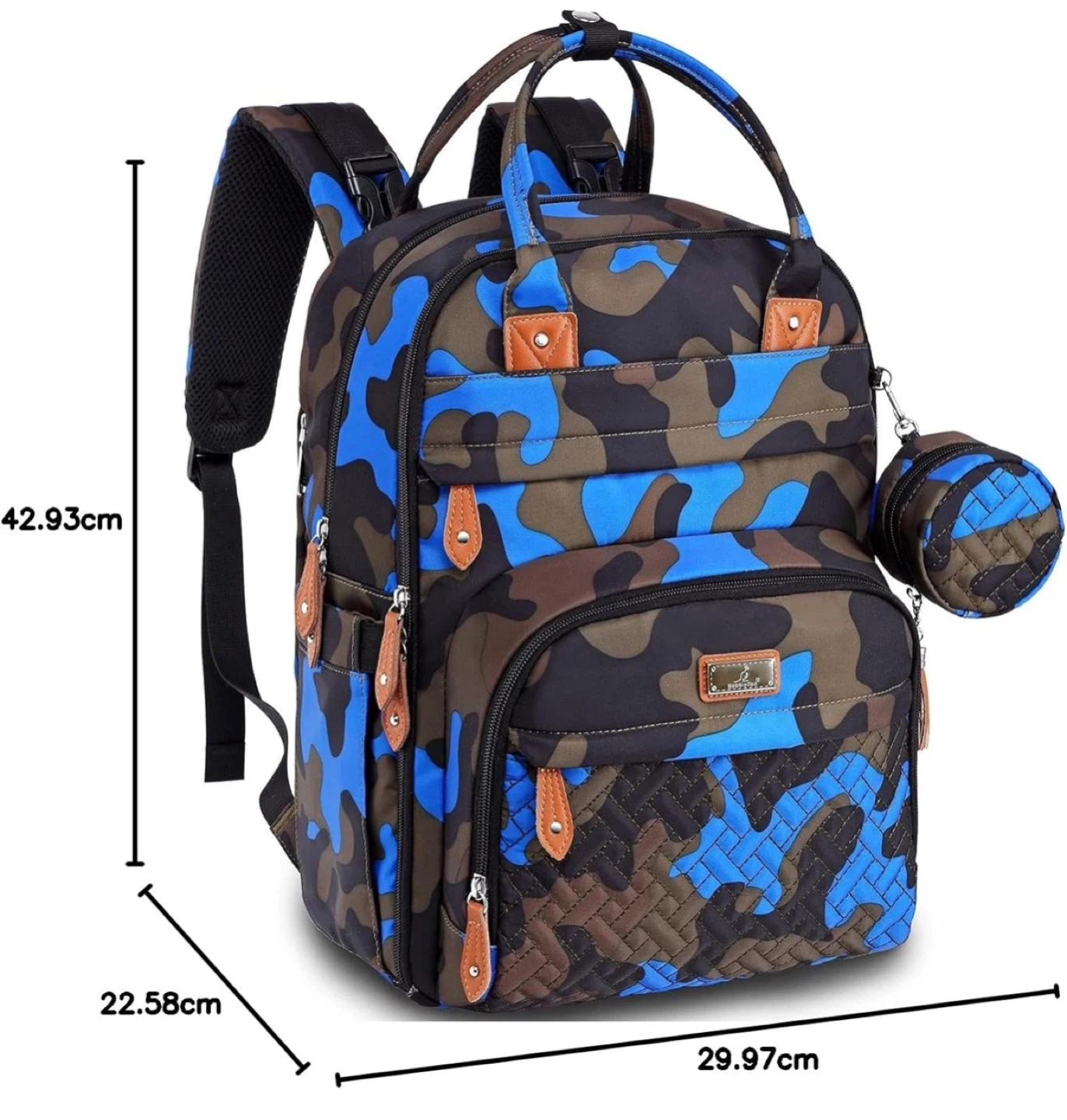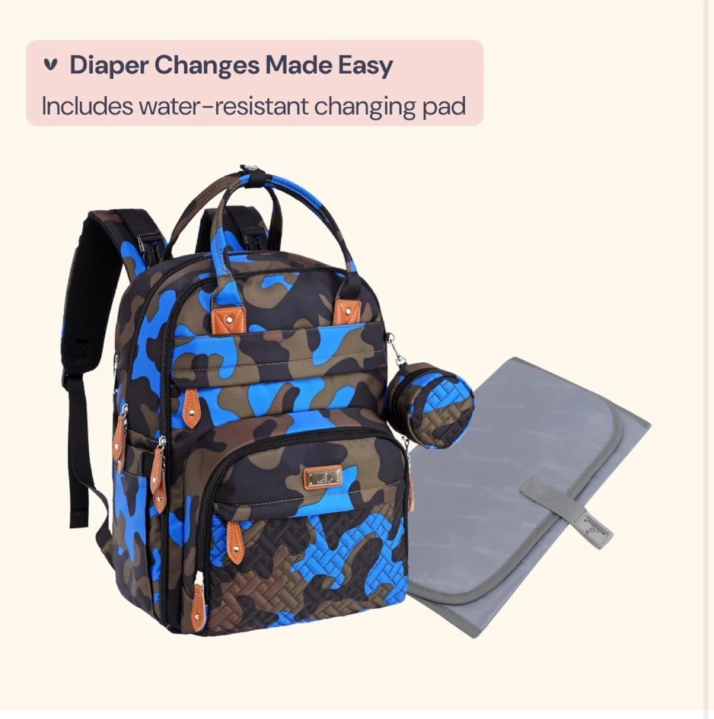 This diaper bag backpack has a camouflage pattern with blue accents. It offers large capacity with 17 pockets and insulated bottle compartments. It also includes a wet wipes sleeve for quick access.