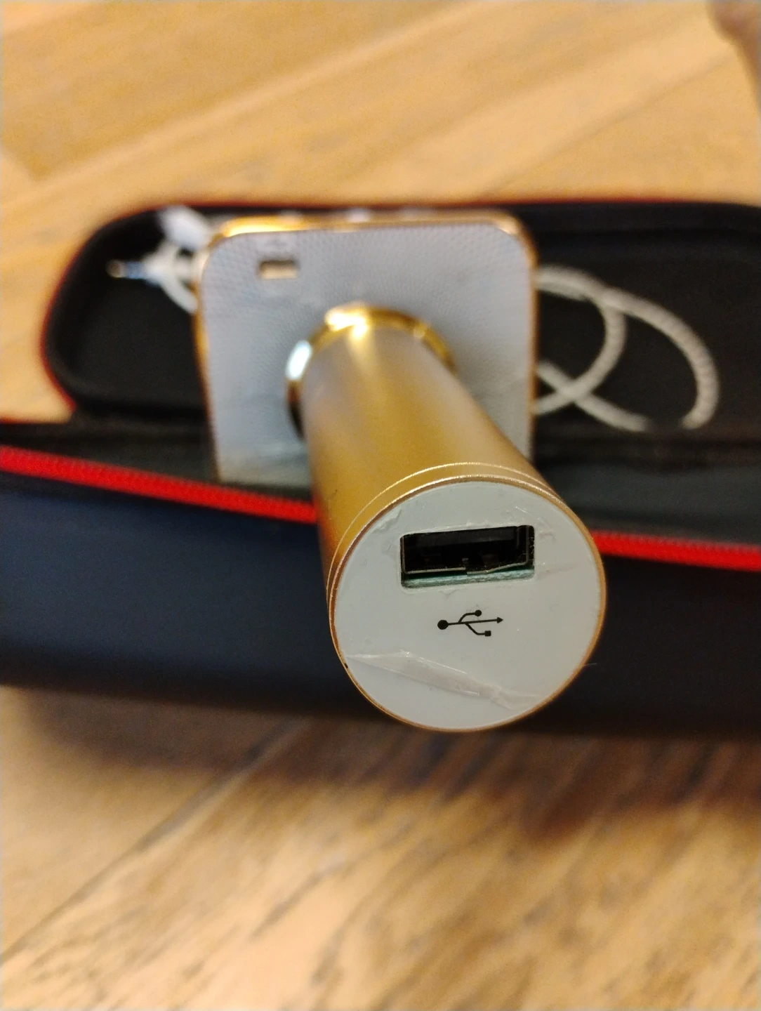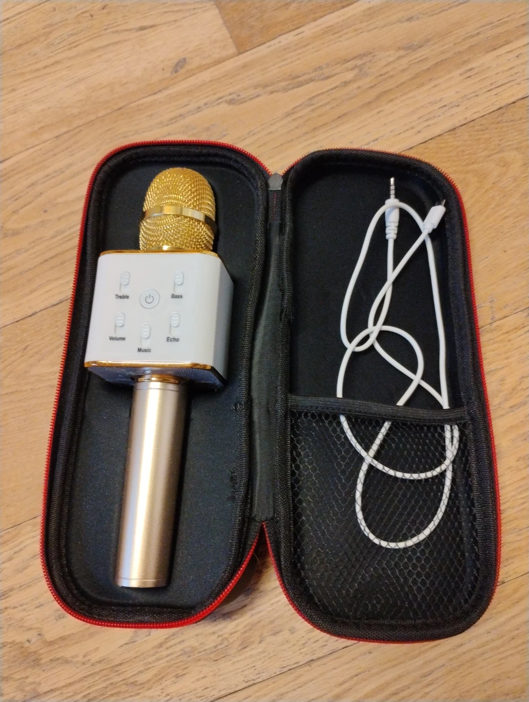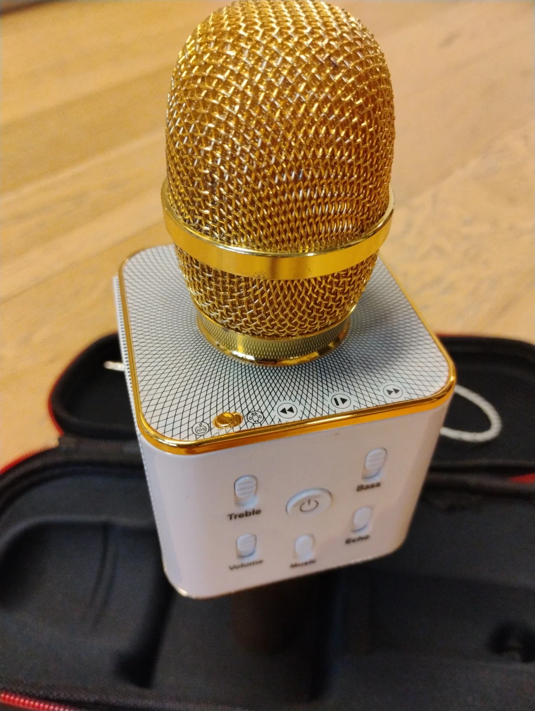 Selling a gold karaoke microphone with build in speakers. It has controls for volume, music, treble, bass, and echo. Perfect for some karaoke fun! Charging cable included.