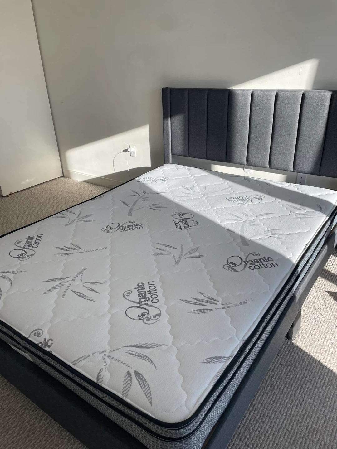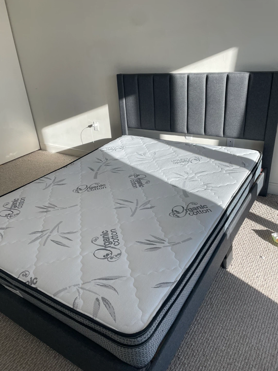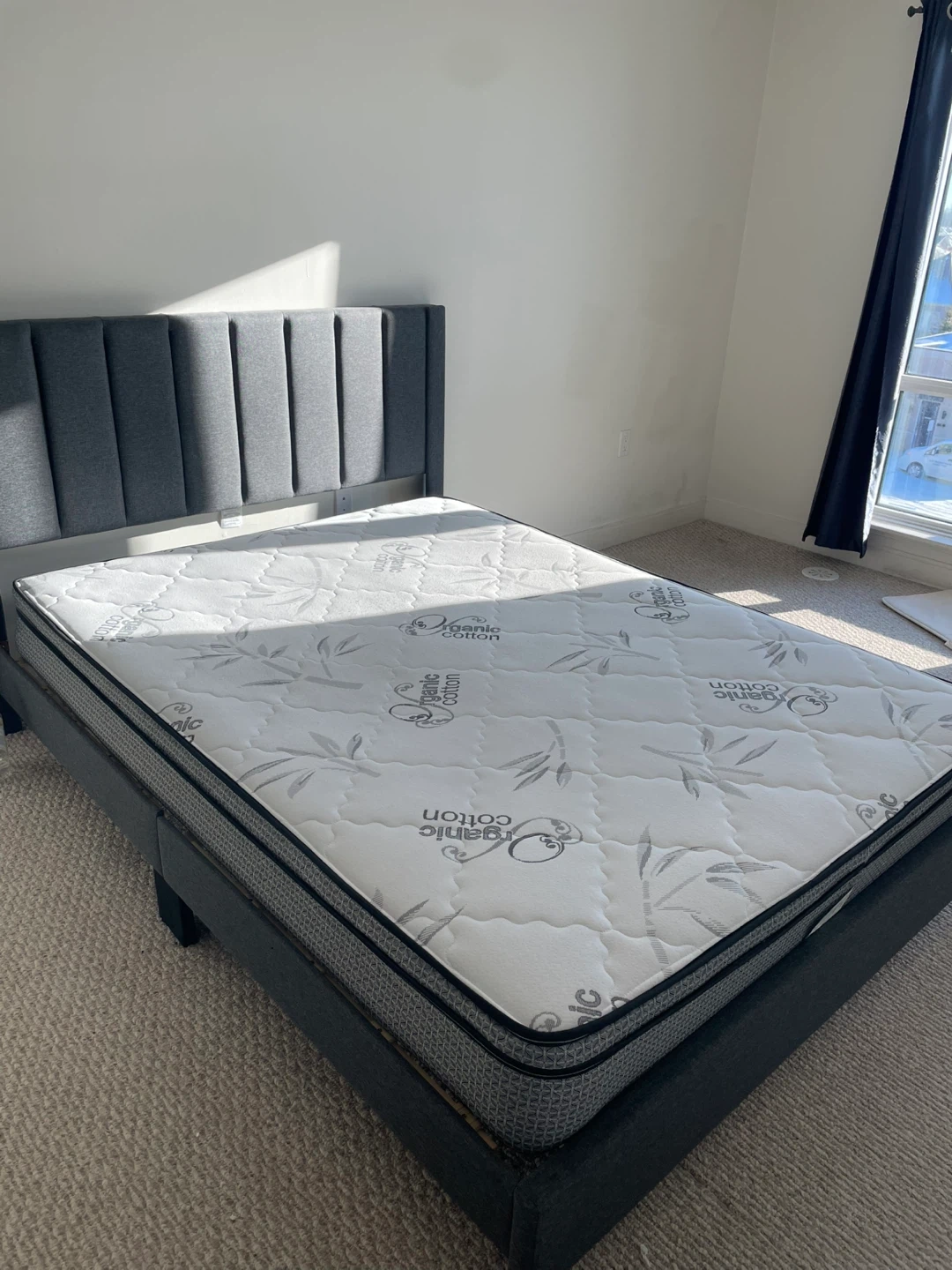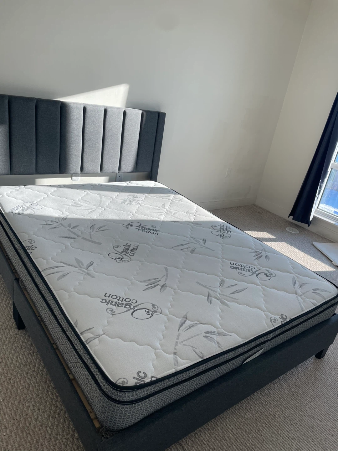 Selling a stylish modern upholstered bed frame with a clean, supportive mattress. This set is perfect for anyone furnishing a bedroom, condo, or guest room with a minimal, contemporary look.