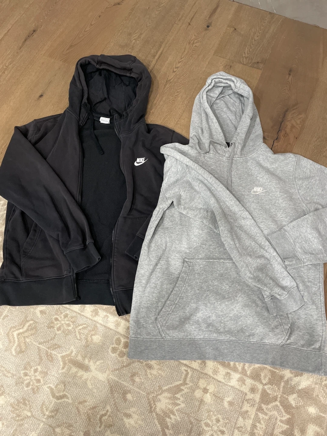 Two Nike hoodies, one black zip-up and one grey pullover. Both feature the classic Nike logo. They're made from a comfortable cotton blend material.