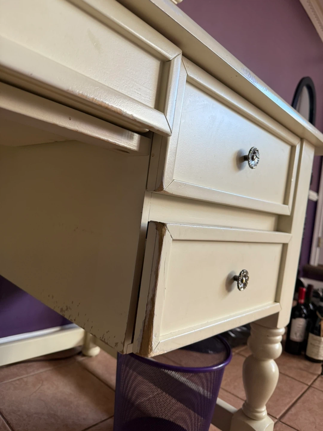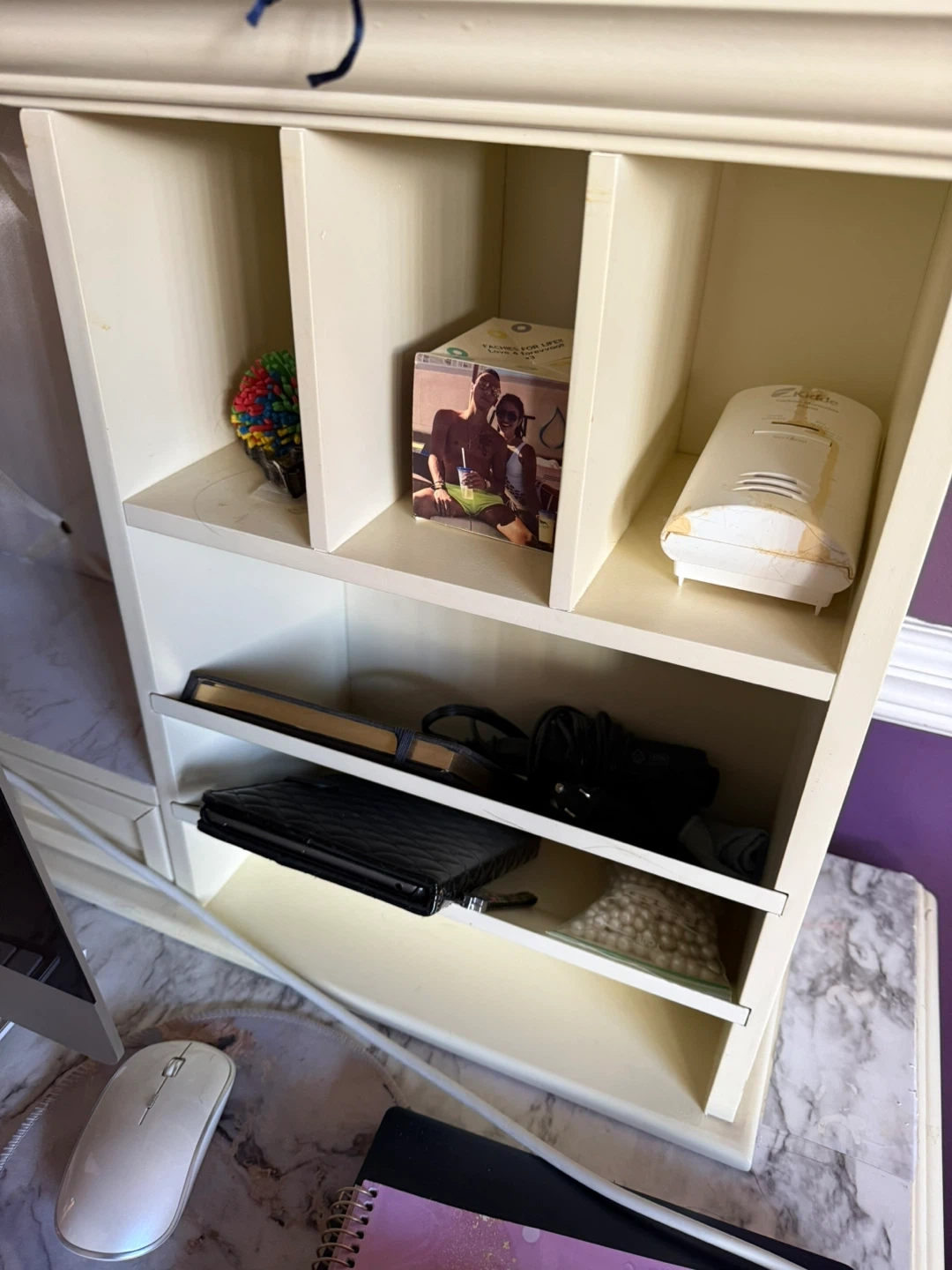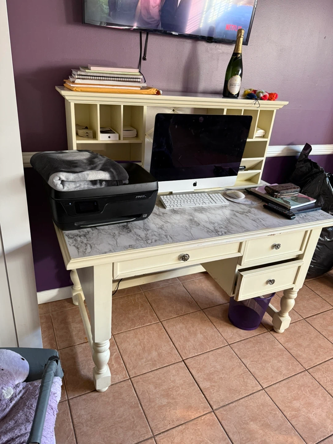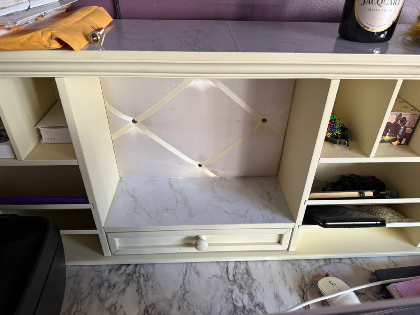 20Selling a charming off-white desk featuring a stylish faux marble top. It has a drawer and several shelves for storage. It shows some signs of use. Top to bottom - 52” tall Floor to desk - 30” H Top part 20” H x 48” W x 10” L