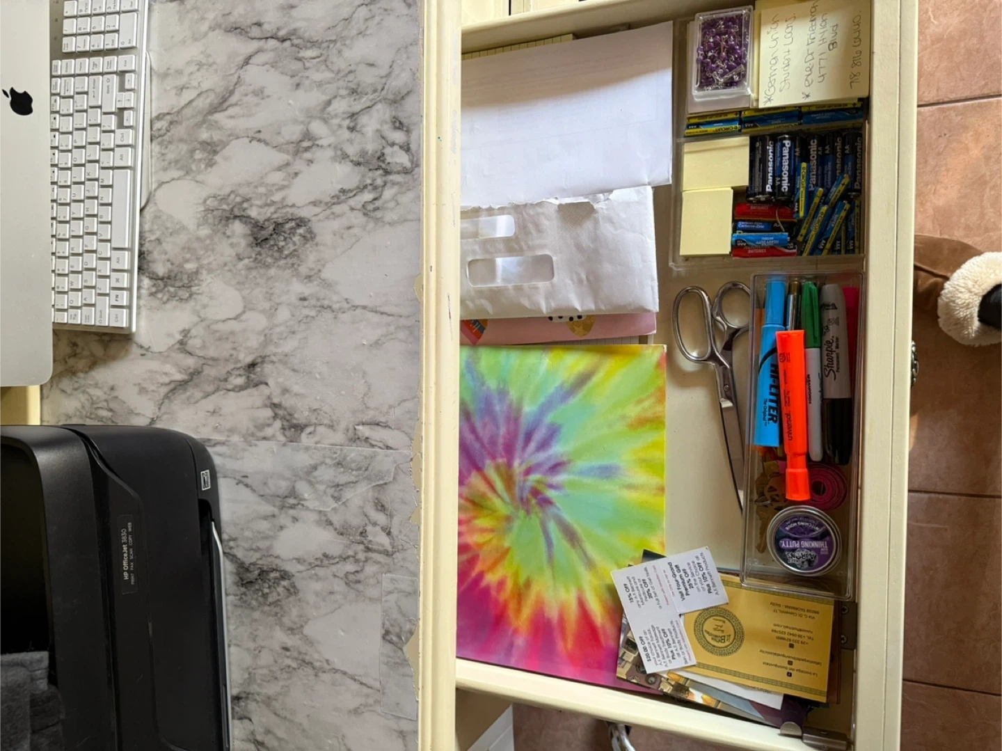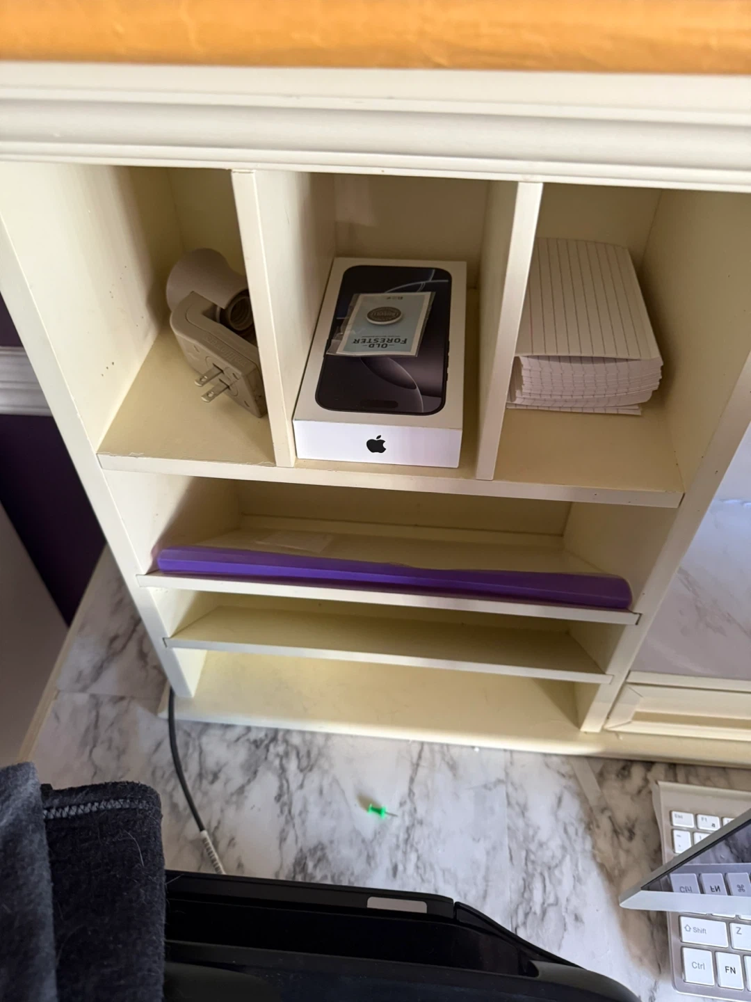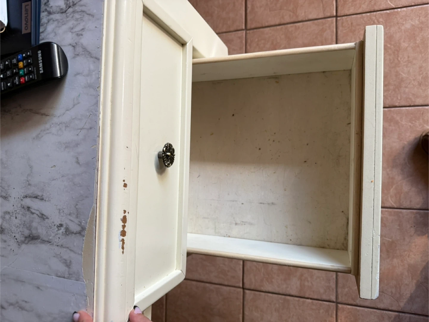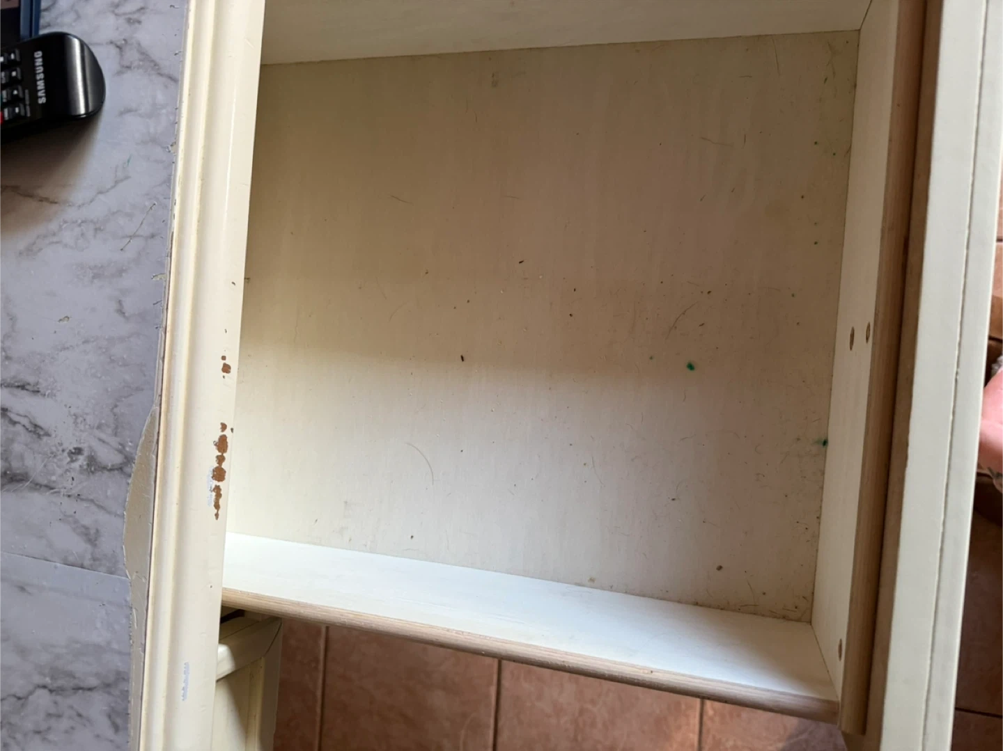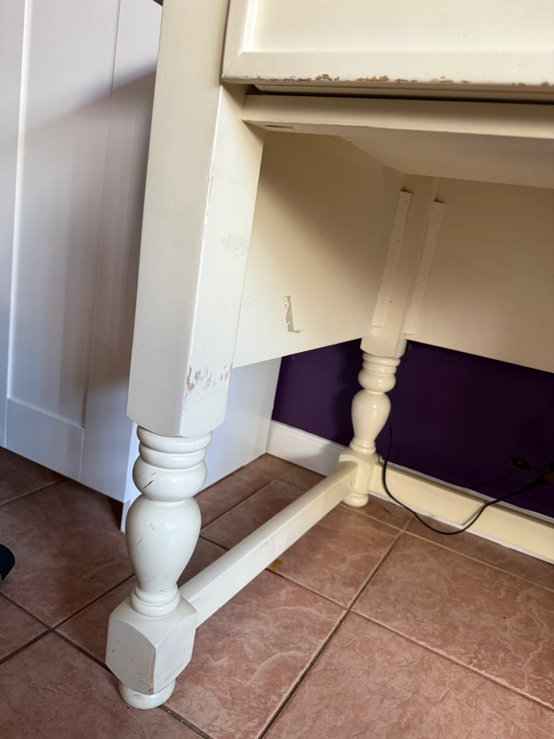 20Selling a charming off-white desk featuring a stylish faux marble top. It has a drawer and several shelves for storage. It shows some signs of use. Top to bottom - 52” tall Floor to desk - 30” H Top part 20” H x 48” W x 10” L
