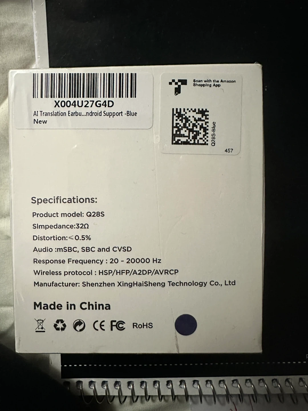 These AI real-time language translator earbuds are blue. They feature upgraded noise-canceling and are optimized for translation accuracy. The response frequency is 20 - 20000 Hz.