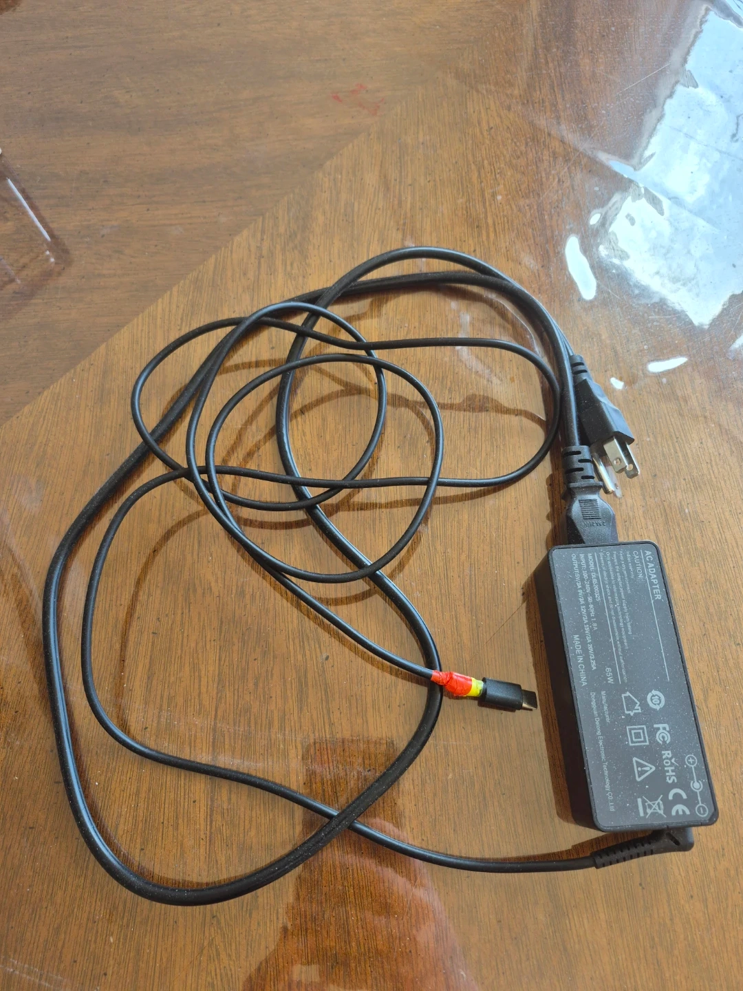 It doesn't work very well, but maybe someone knows how to fix it. This is a 65W AC adapter with USB-C output. It supports multiple voltage and amperage outputs, including 5V/3A, 9V/3A, 12V/3A, 15V/3A, and 20V/3.25A. Made in China by Dongguan Delong Electronic Technology CO.Ltd.
