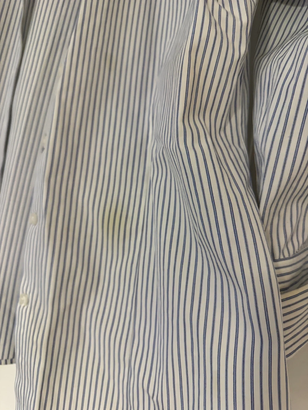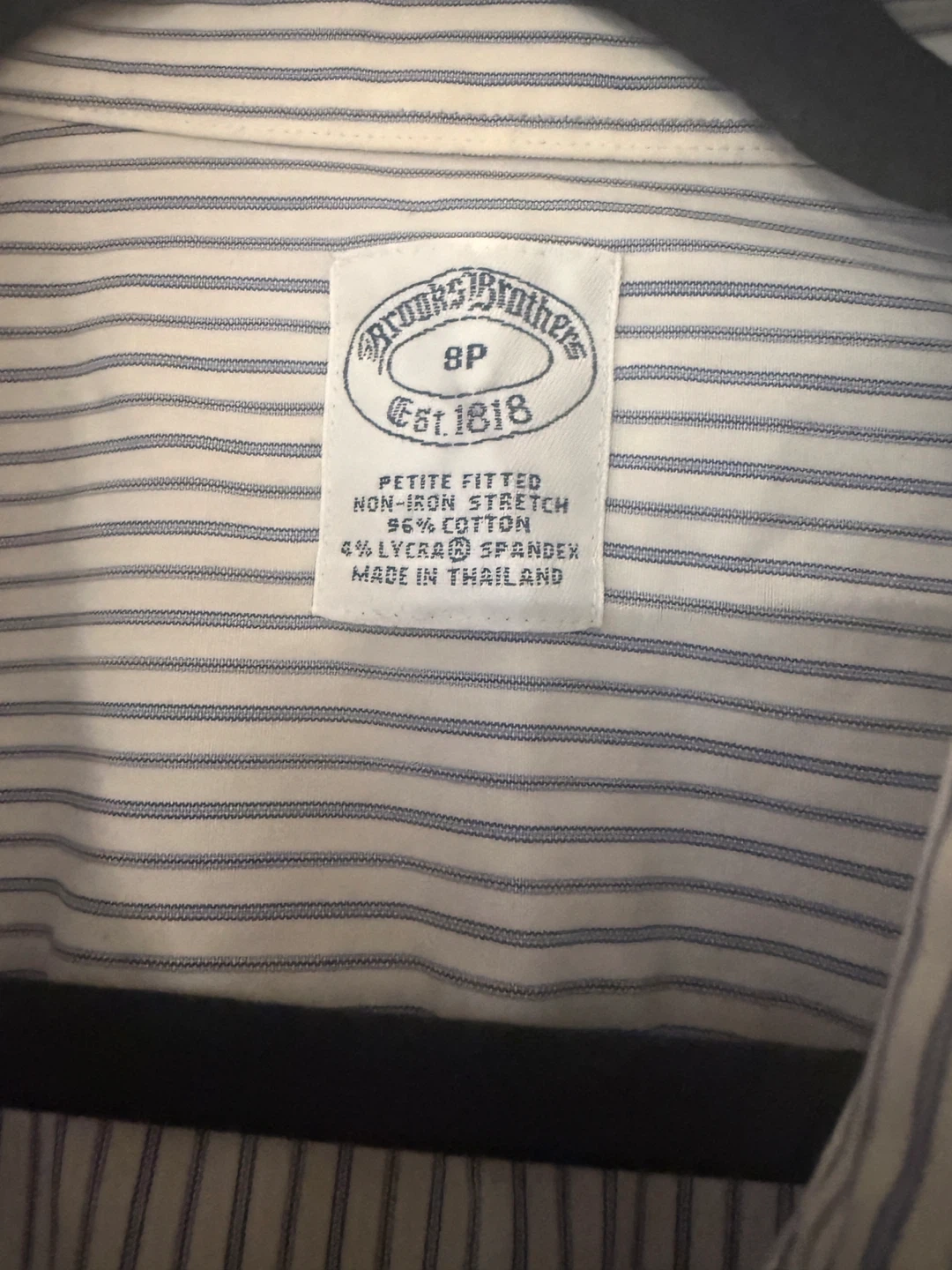 Selling a Brooks Brothers striped shirt in size 8P. It's a petite fitted, non-iron stretch shirt made of 96% cotton and 4% Lycra spandex. There is a small stain on the shirt.