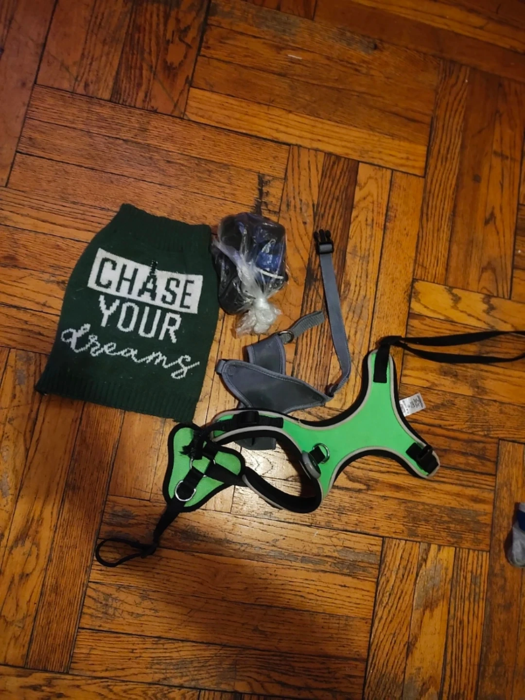 It's green with a removable sweater that says 'CHASE YOUR DREAMS'. Includes a leash and a small charging light. Light works sometimes on the bright green and has some wear.