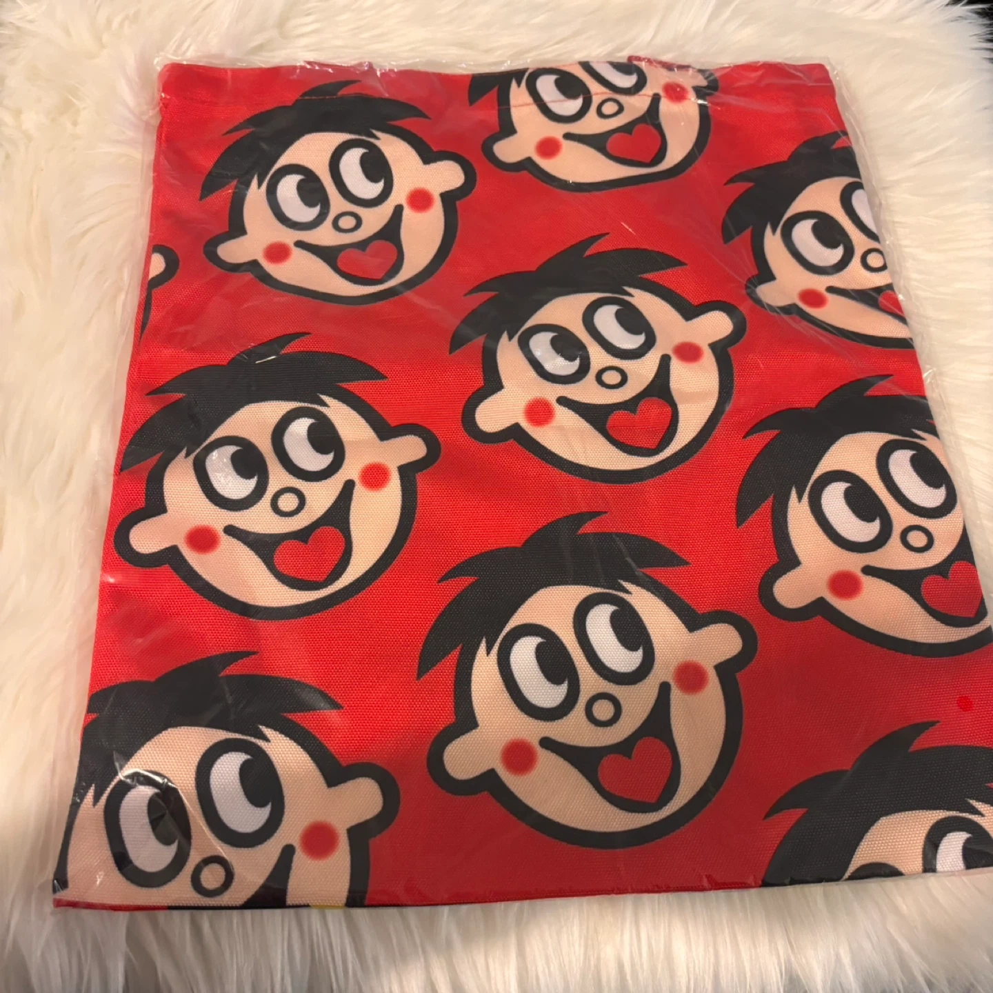 A fun tote bag featuring a repeating pattern of a happy cartoon character. It's made of durable fabric and comes sealed in its original packaging. This bag is great for carrying everyday essentials or as a gift!