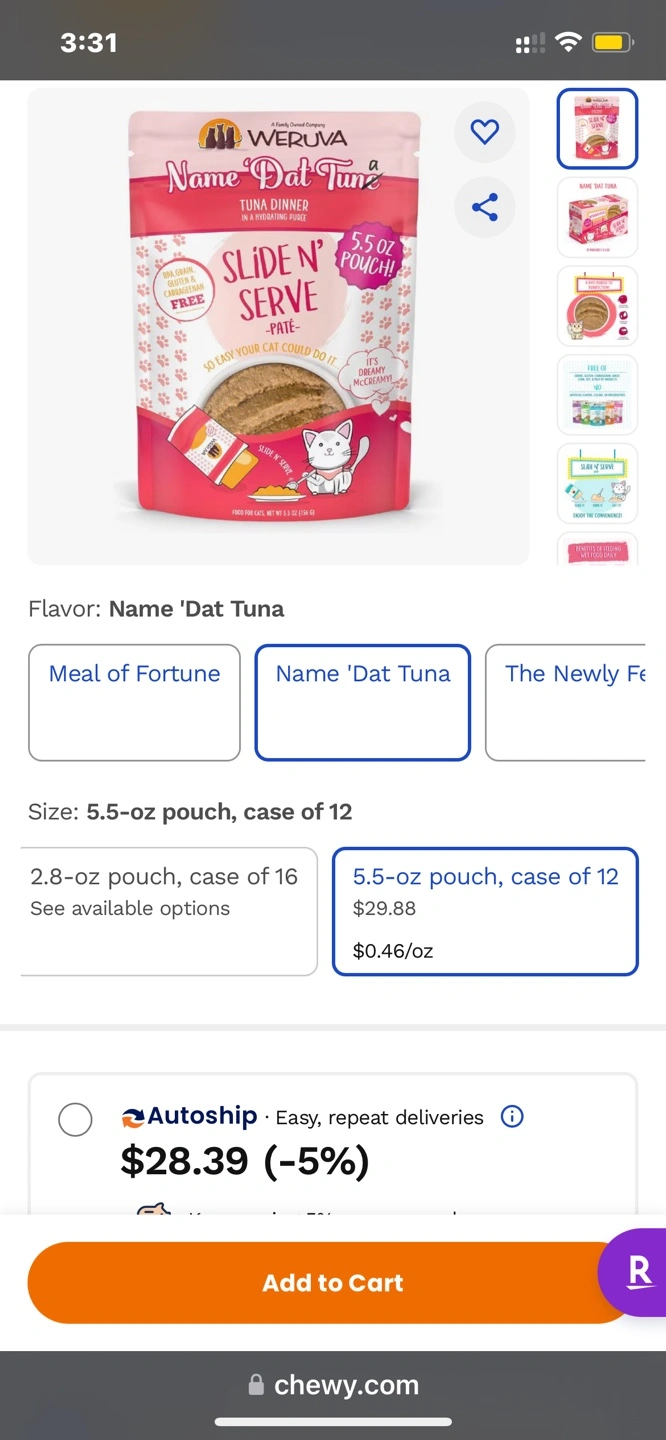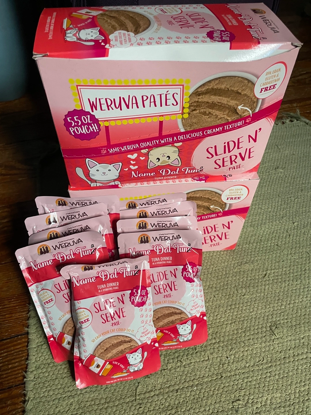 5.5 oz pouches of Weruva Name 'Dat Tuna pate cat food. Tuna dinner in pate form. Slide N' Serve.