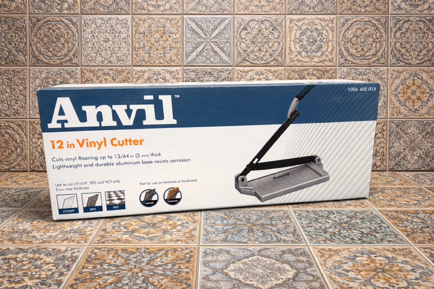 This is a 12-inch Anvil vinyl cutter. It cuts vinyl flooring up to 13/64 inches (5 mm) thick. The aluminum base is lightweight, durable, and resists corrosion. Use it to cut LVT/LVP, SPC, and VCT only.