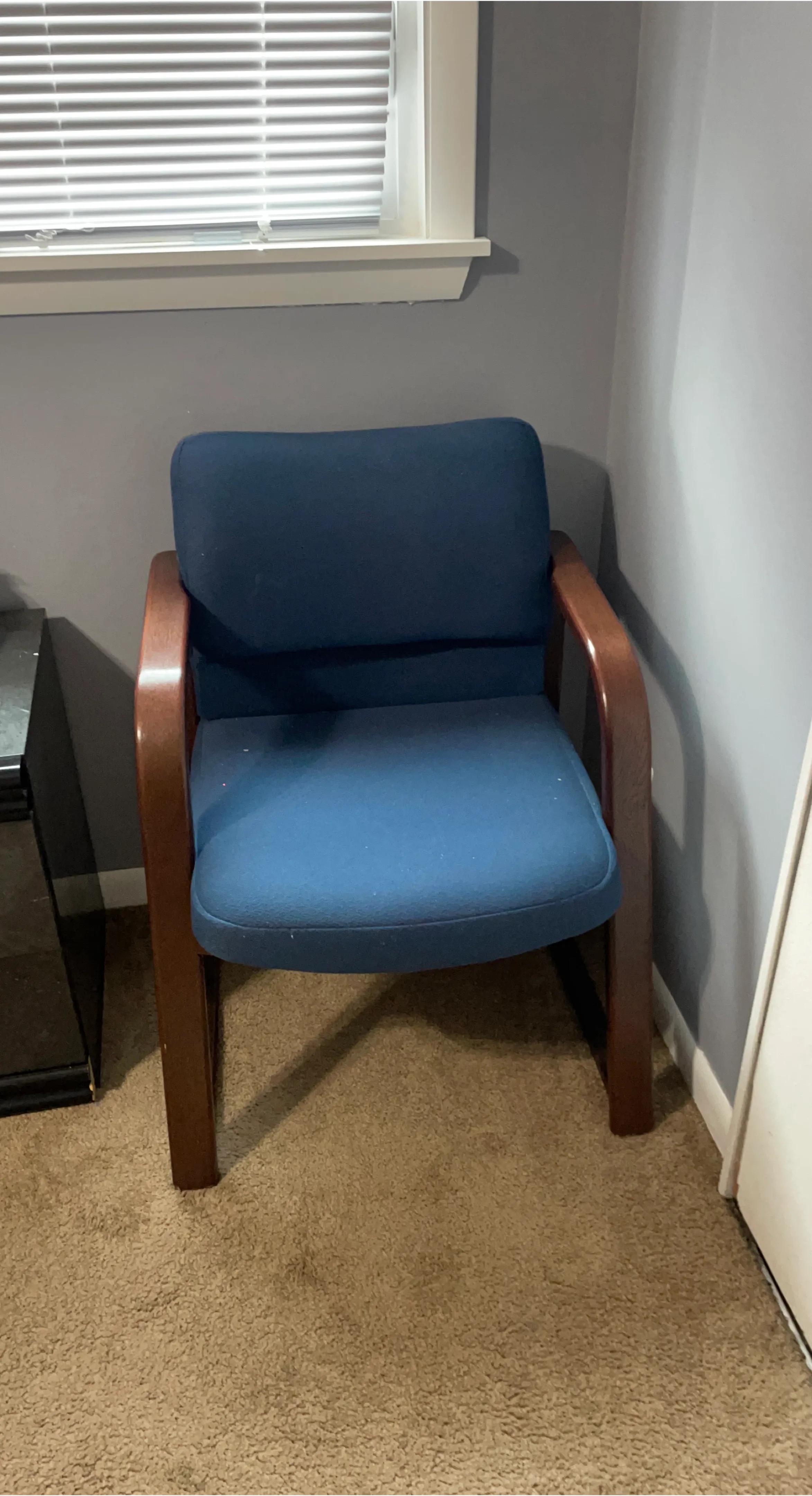 This chair features a comfortable blue upholstered seat and back with stylish wood-finished armrests. Its sturdy construction makes it a great addition for any waiting area or office space. Solid wood frame.