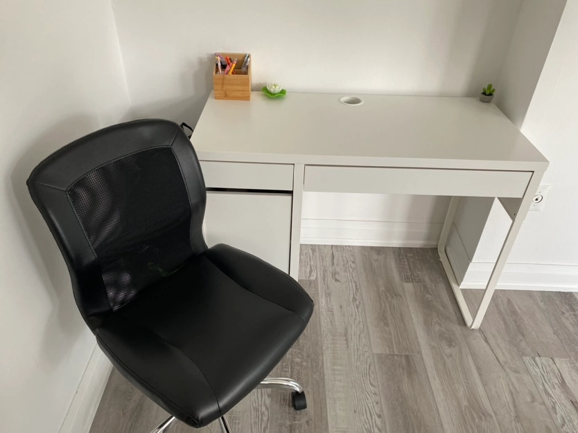 White desk 105x50 cm. Black leather spinny chair. Available for pickup only but willing to assist in loading.Thank you!