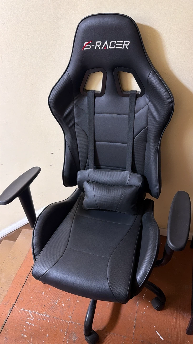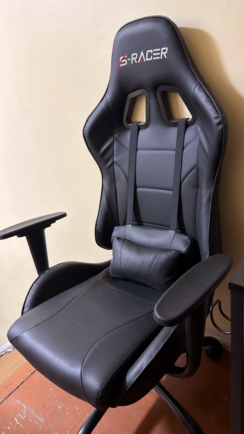 S-Racer gaming chair in black. It features adjustable lumbar support and a headrest pillow. The chair is made of faux leather and has a sturdy base with wheels.