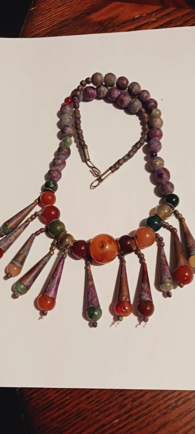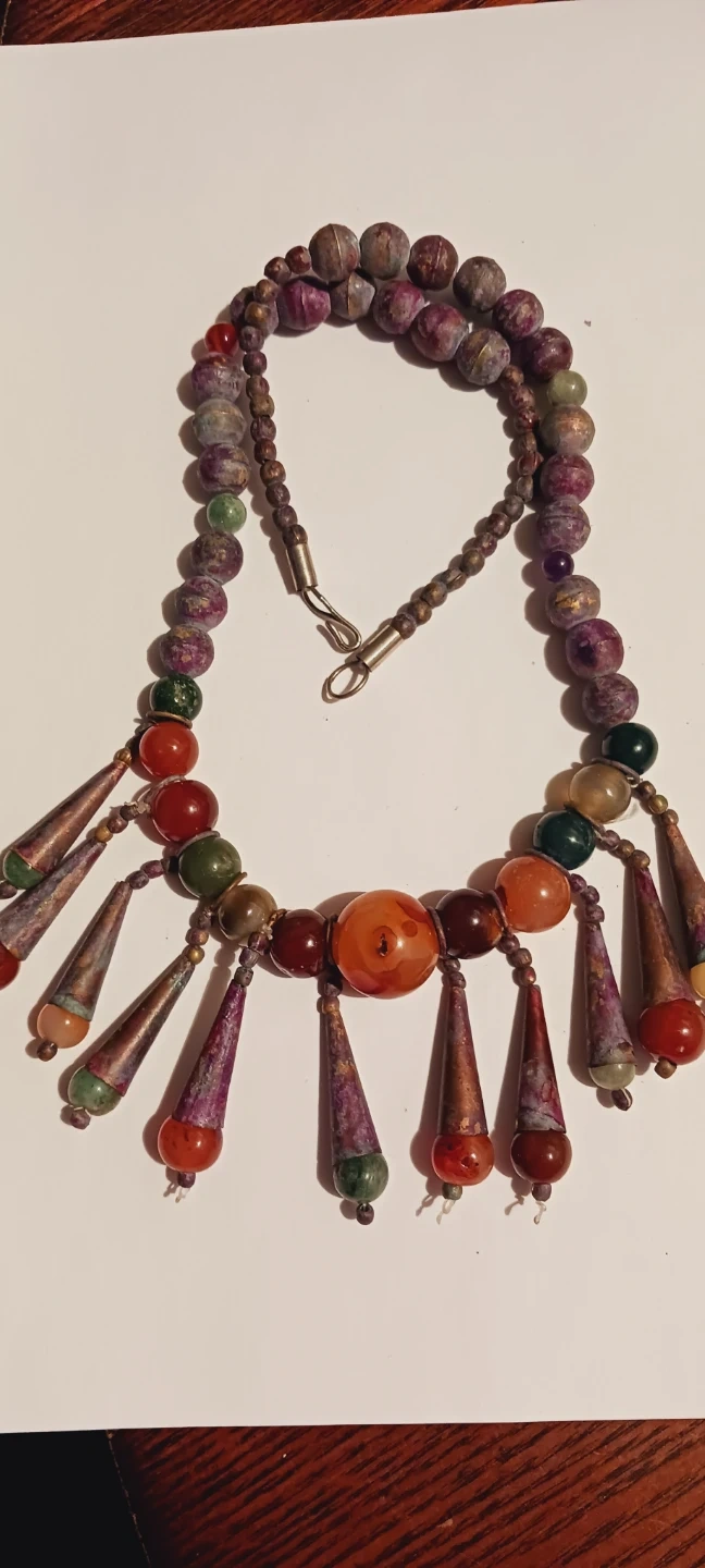 Gorgeous Unique Native American hand crafted necklace features a variety of colorful Multi Gemstones beads, including a large central Carnelian stone. It's adorned with multiple cone-shaped pendants gemstones. Excellent condition. 20" ALL MY PRICES ARE NEGOTIABLE !!