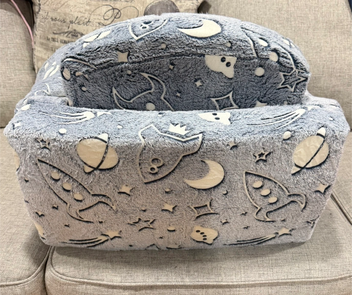 This kids couch chair features a fun space theme with rockets, moons, and stars. It's made of soft, fluffy material and glows in the dark. It can be used for reading, resting, playing, or sleeping, offering a cozy spot for little ones. The cover is removable for easy cleaning.