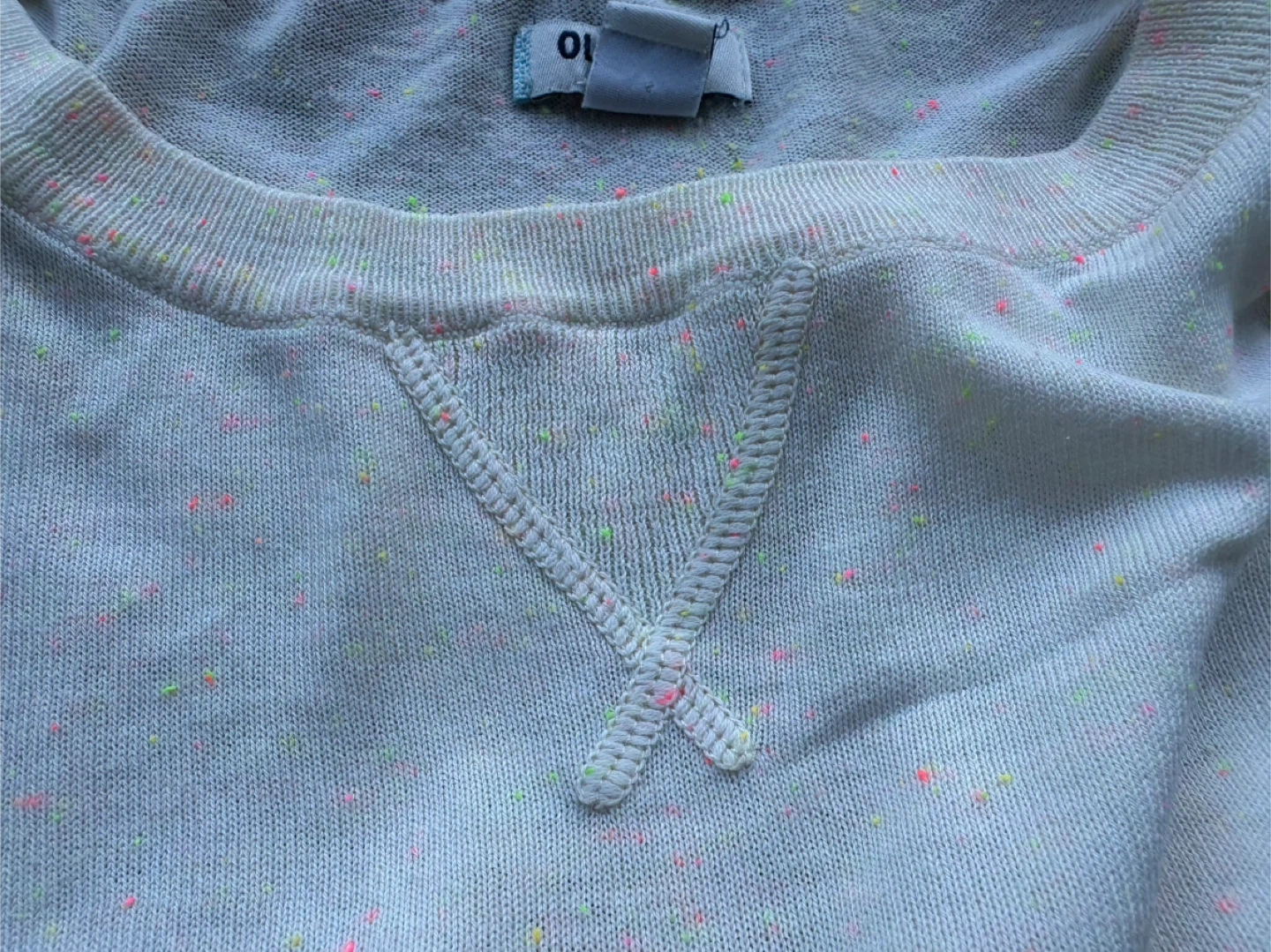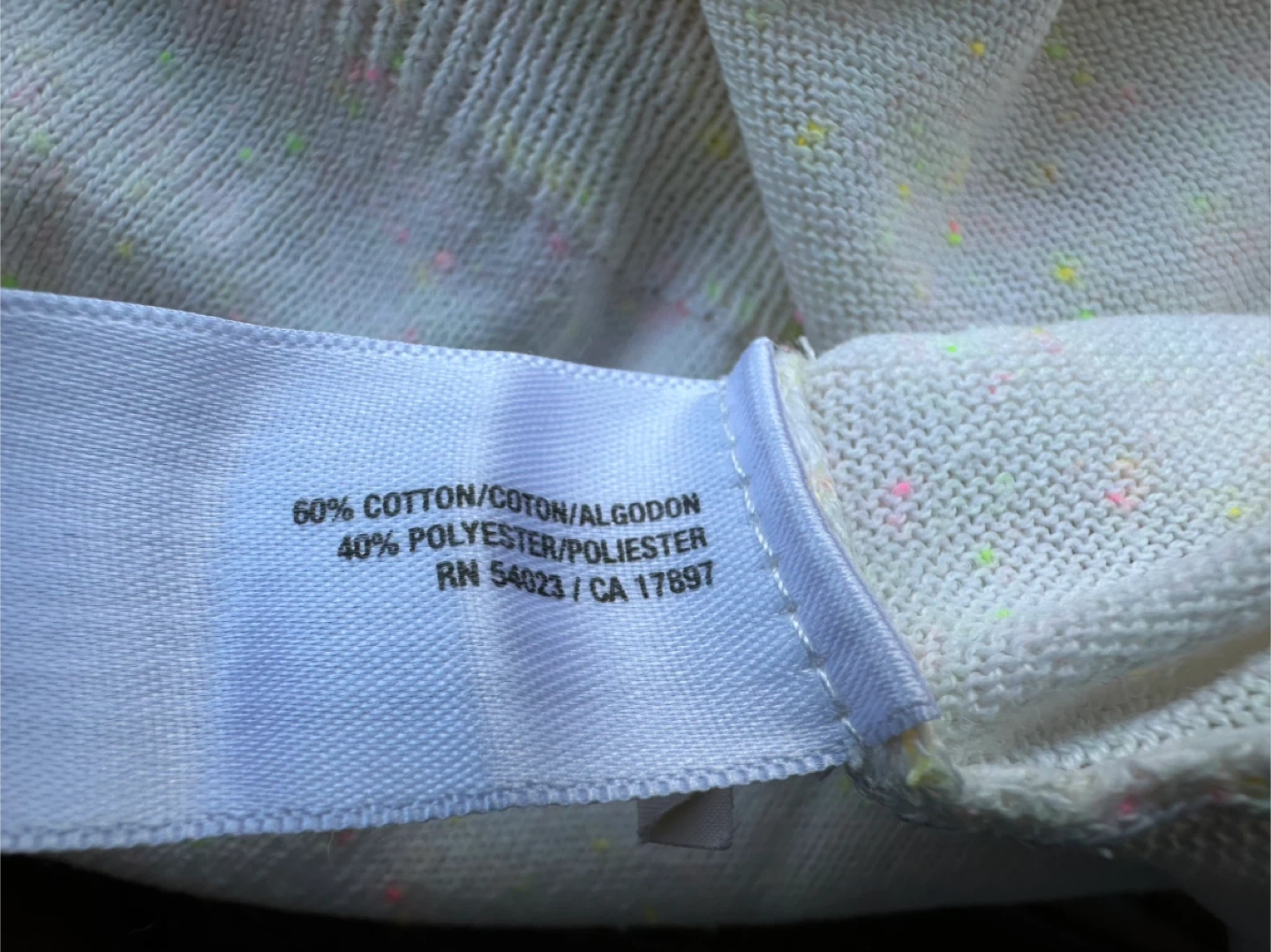 This cream-coloured sweater from Old Navy has a subtle speckled design with flecks of pink, yellow, and green. It's a size medium and made from a 60% cotton, 40% polyester blend. The sleeves feature a roll-tab detail for adjustable length.