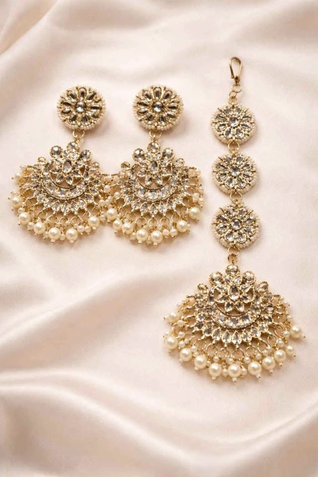 Elegant Gold-Tone Tikka & Earrings Set with Pearl Detailing