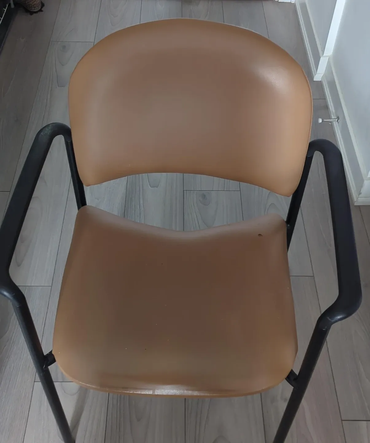 This is a tan armchair with a black metal frame. The seat and back are upholstered in a durable, easy-to-clean material. It's a sturdy chair suitable for various spaces.