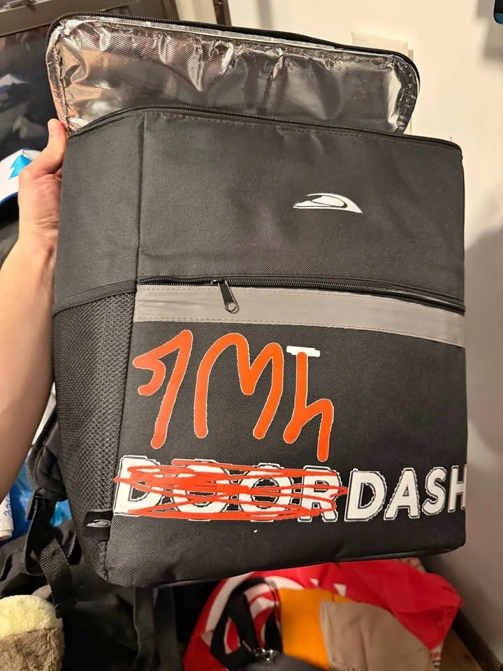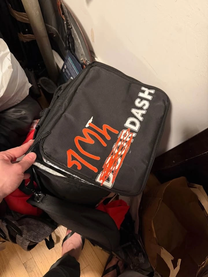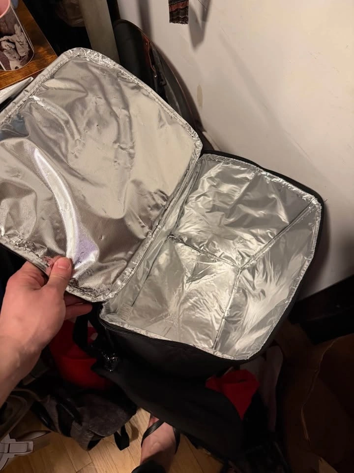 Spacious insulated food delivery bag with a big main compartment and foil lining to keep food warm or cold. Features side mesh pockets and a reflective strip on the front. Great for groceries, picnics, or more deliveries.