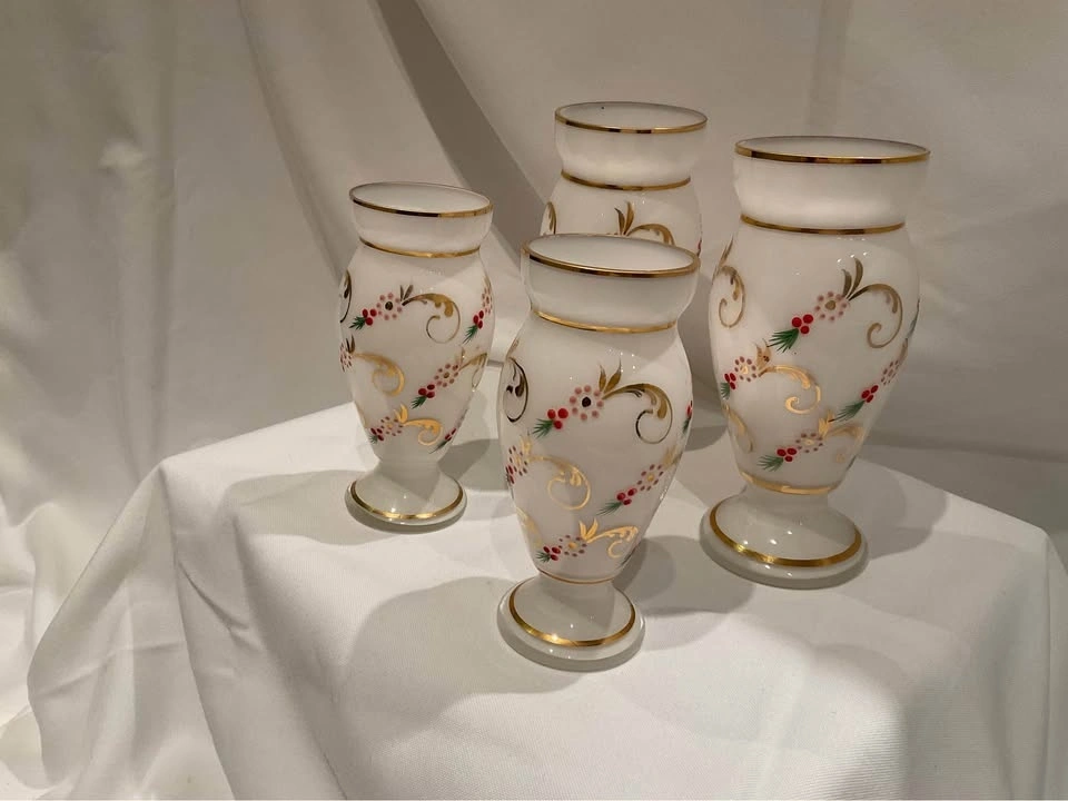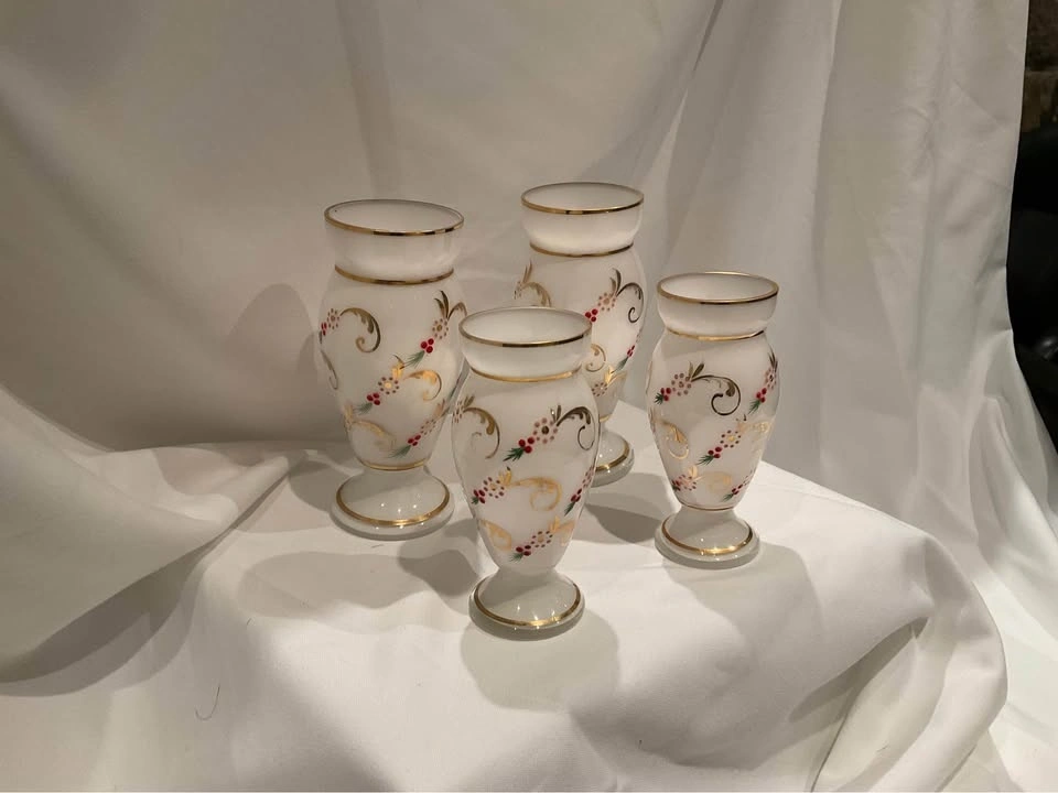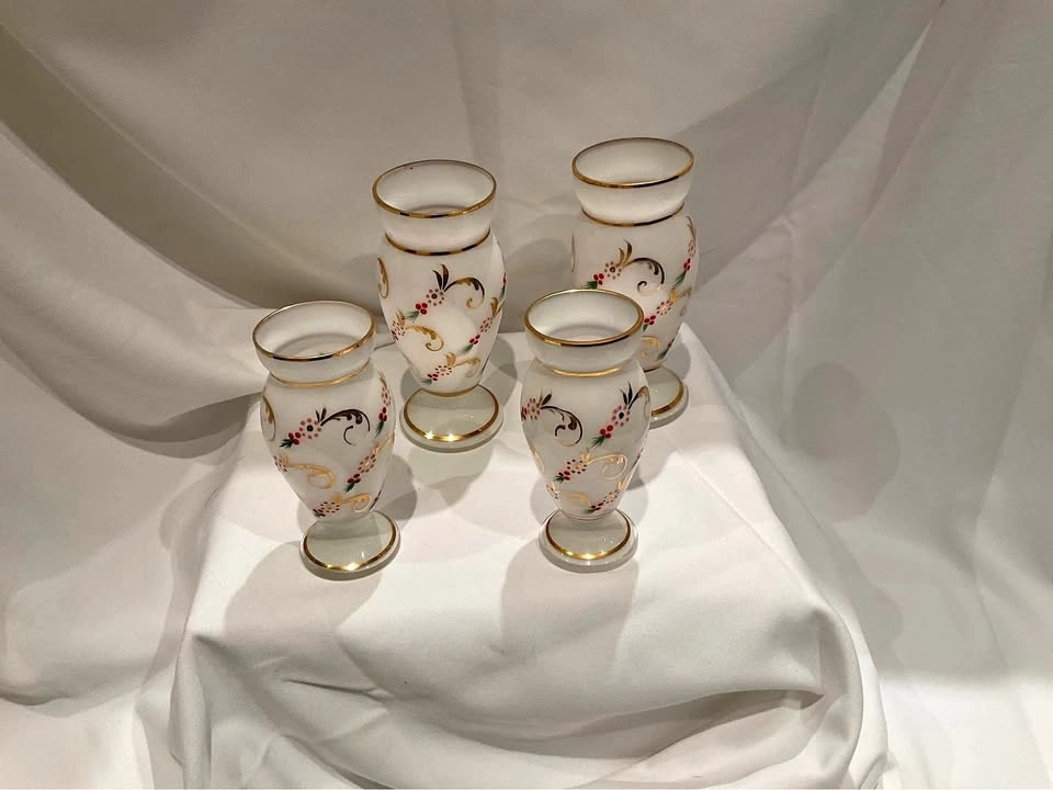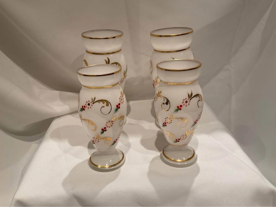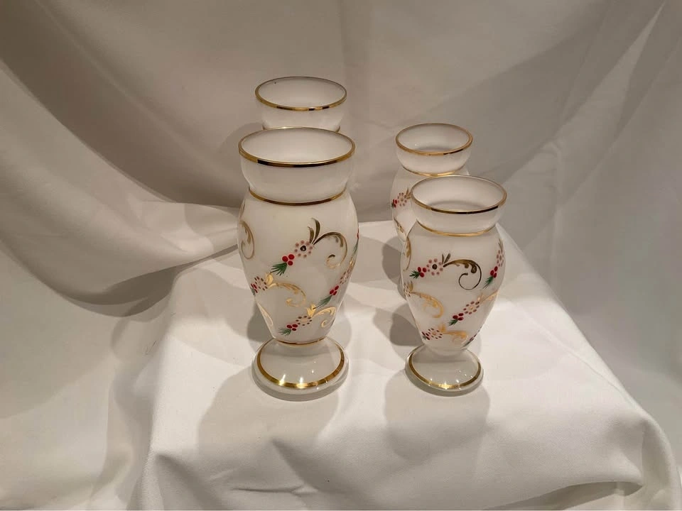 Lovely vintage hand painted opaque glass Victorian vases, mid 20th century. Pristine condition - no cracks, no chips. Large vase height 7 1/2", medium vase height 6". Beautiful hand-painted florals and delicate gold gilt details. #178/640. Smoke & pet free home. Cash only - Richmond Hill / Bathurst & King Rd.