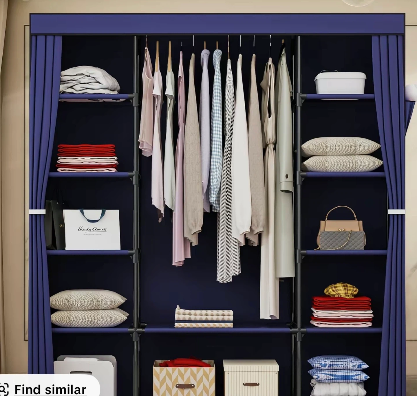 This portable wardrobe features multiple shelves and a hanging rod for clothes storage. It has a durable fabric cover with curtains for dust protection. Includes storage shelves and a clothes rail.