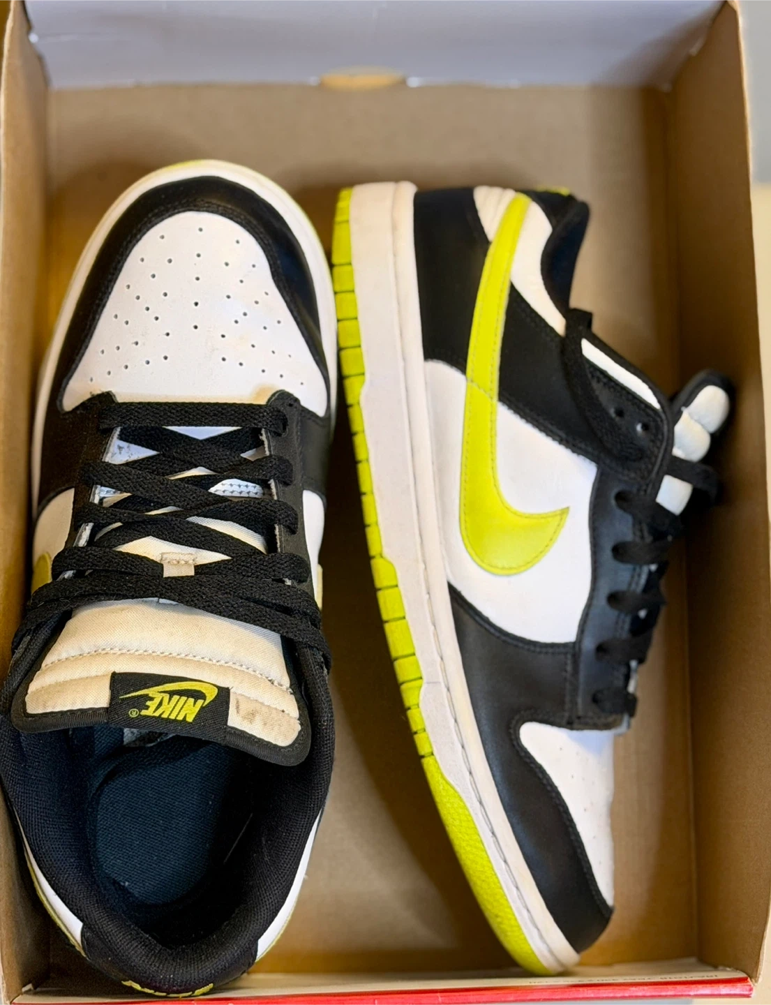 These Nike Dunk Low sneakers feature a white base with black overlays and vibrant volt accents. Rubber sole for durability. Lace-up closure. A classic look that's always in style!