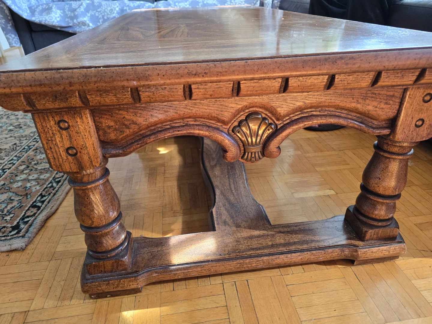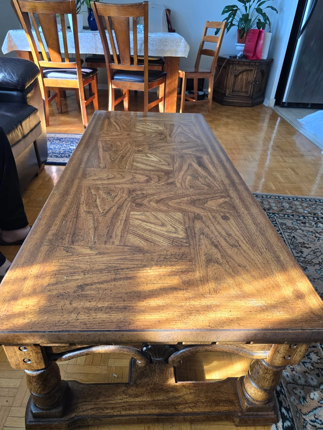This is a beautiful, sturdy wooden coffee table. It features a classic parquet top design and ornate carved detailing on the legs and apron. The warm wood tone would complement many living room decors. It's a substantial piece that adds a touch of timeless elegance to your space.1.60 m ร 0.60m