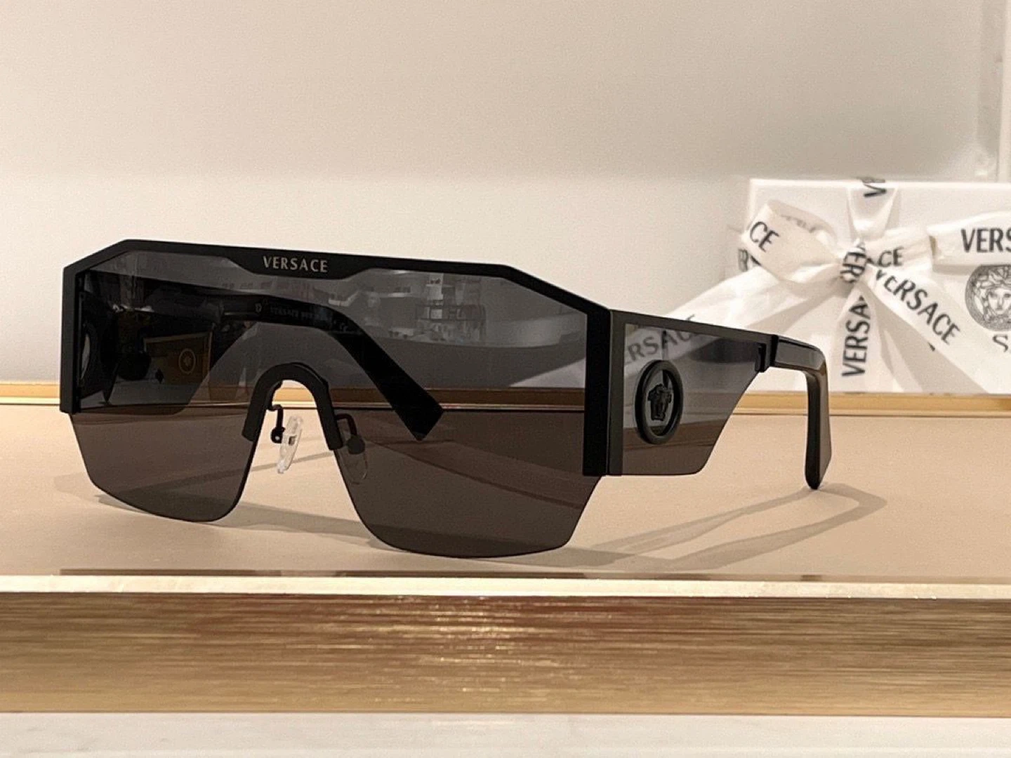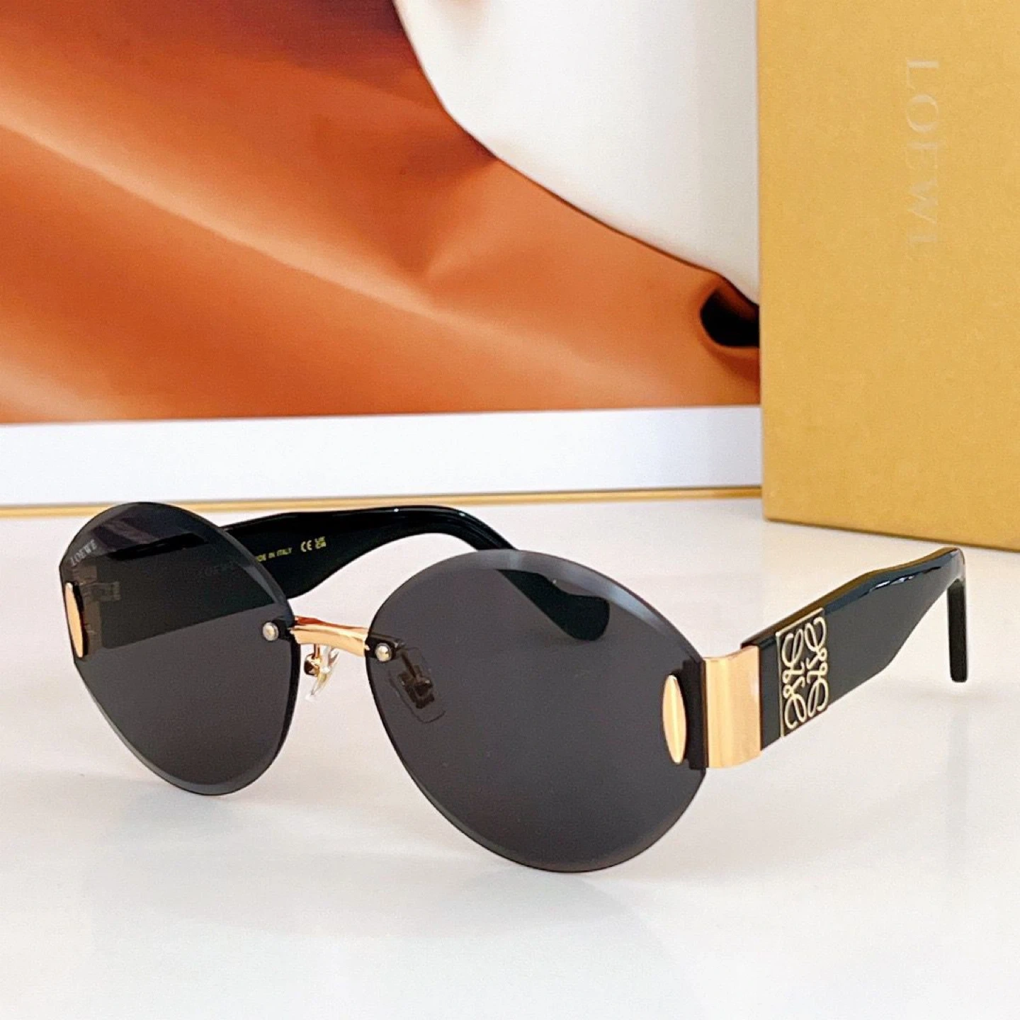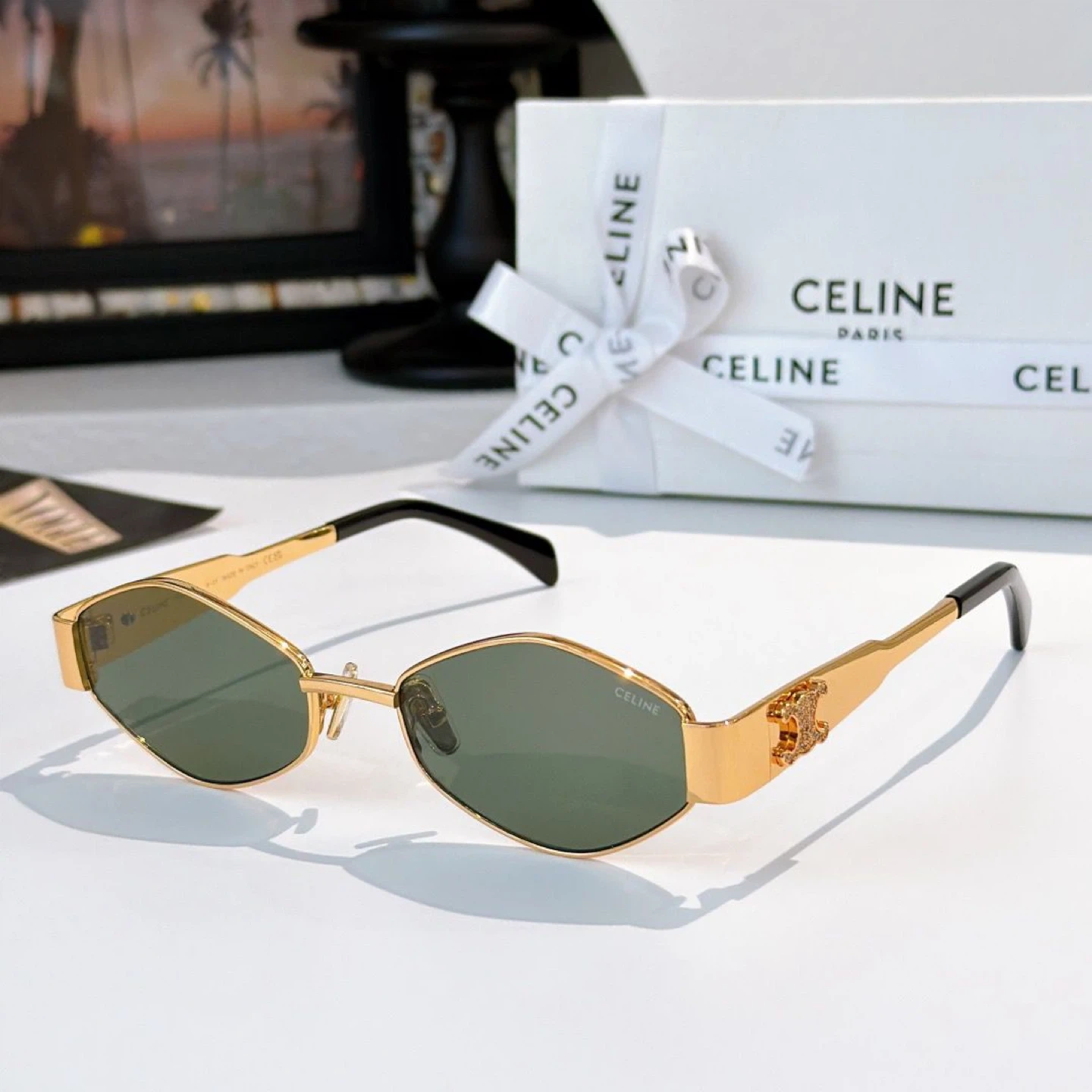 Celine sunglasses with a gold frame and diamond-shaped lenses. Includes original box and ribbon. Made in Italy.