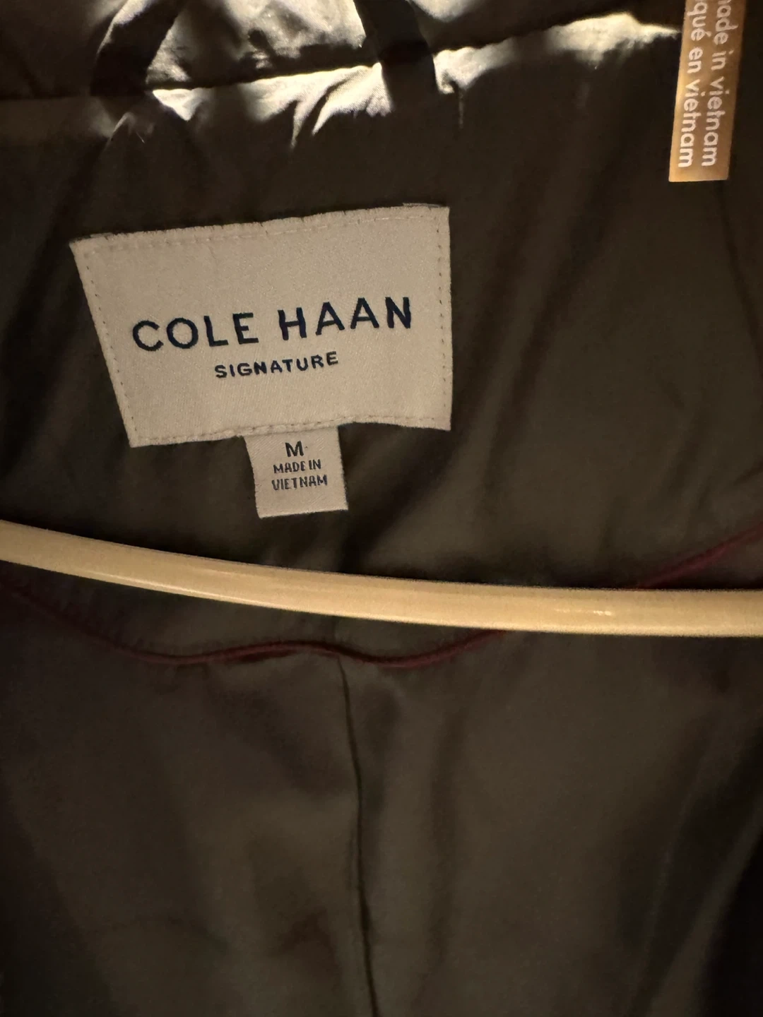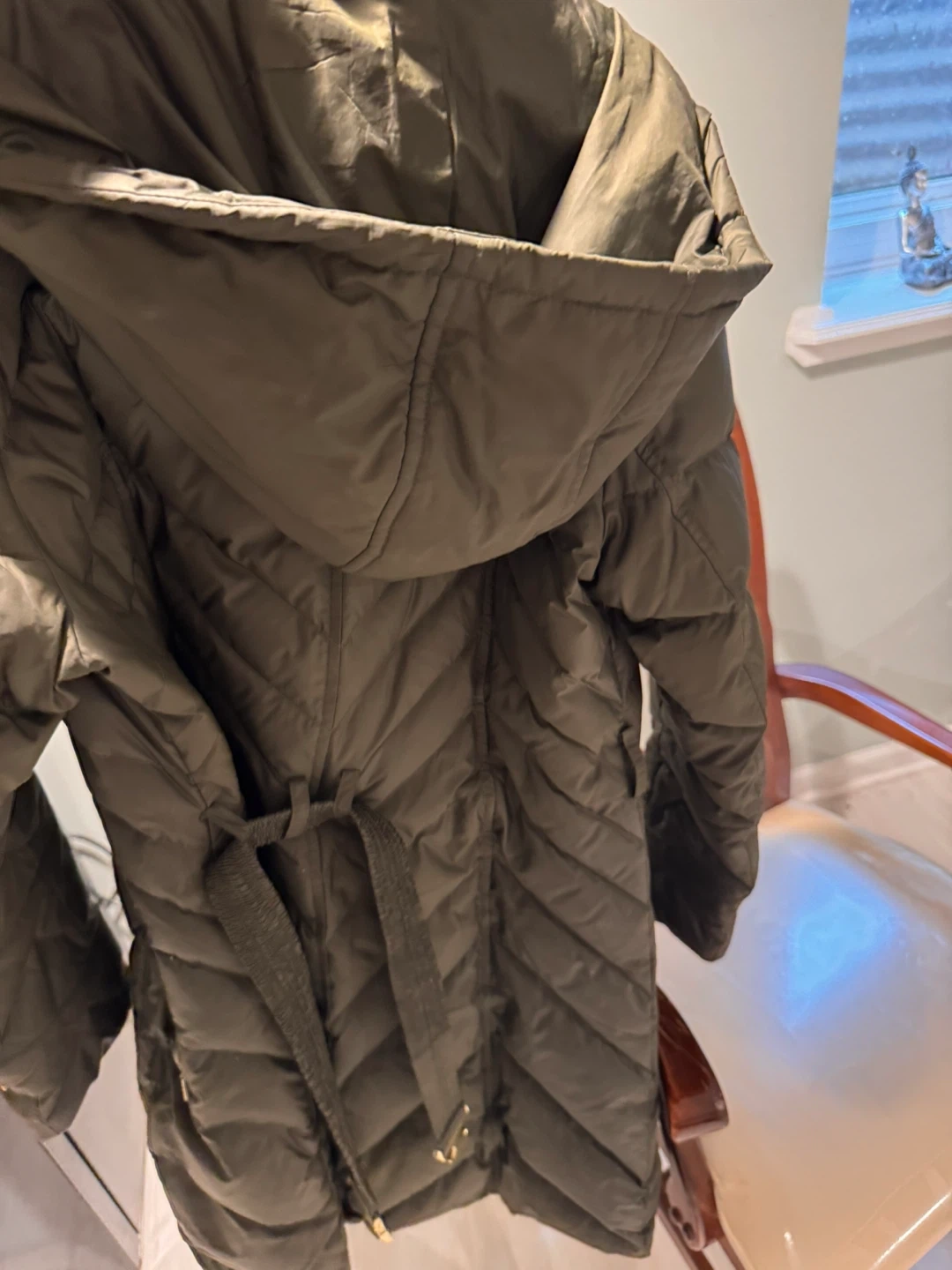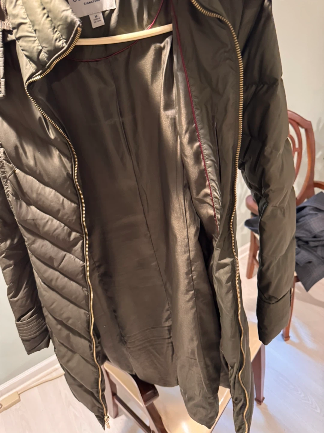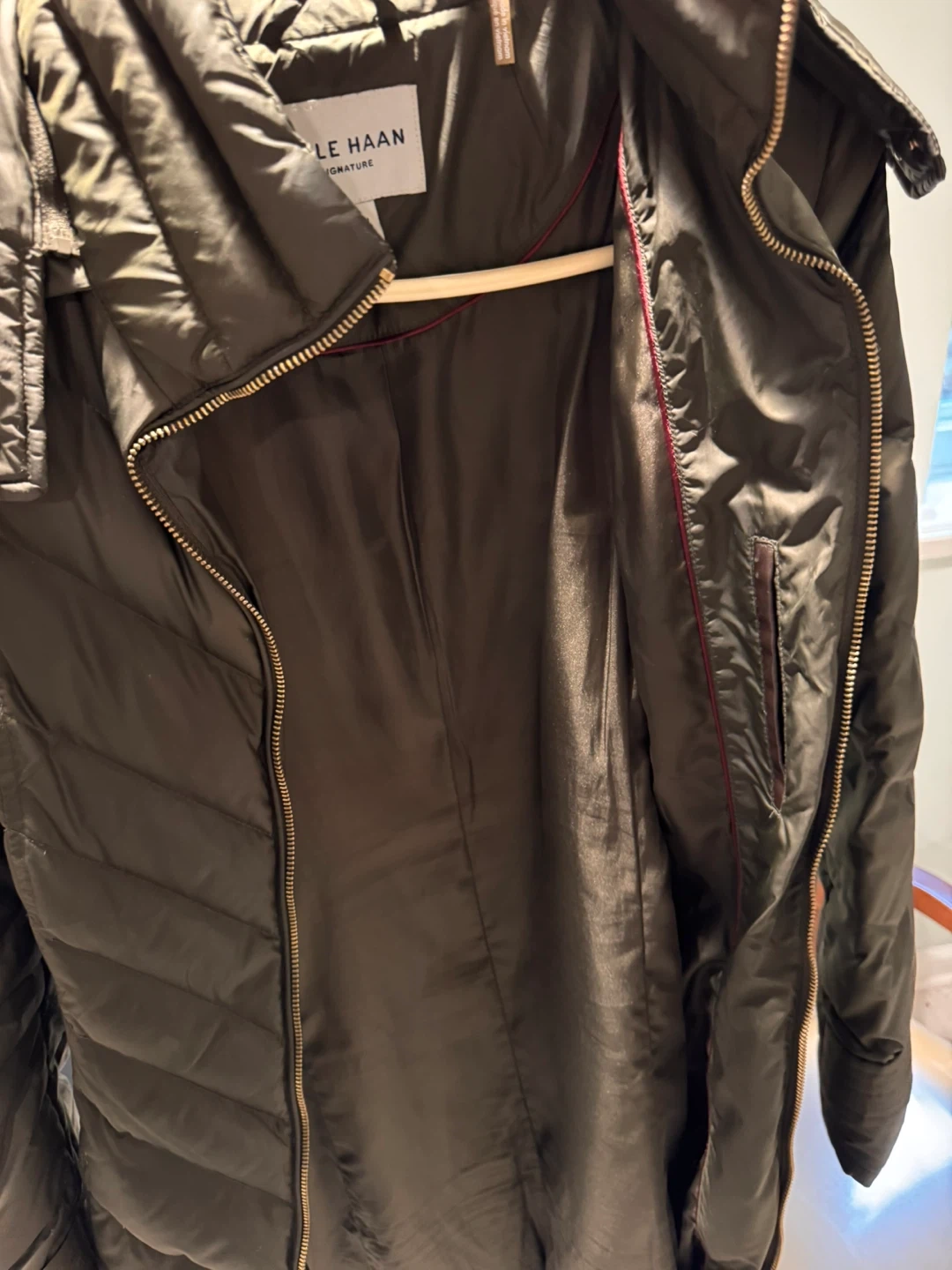 Cole Haan Signature puffer coat in a size Medium. This olive green coat features a full zip closure and a drawstring waist. It's made in Vietnam.