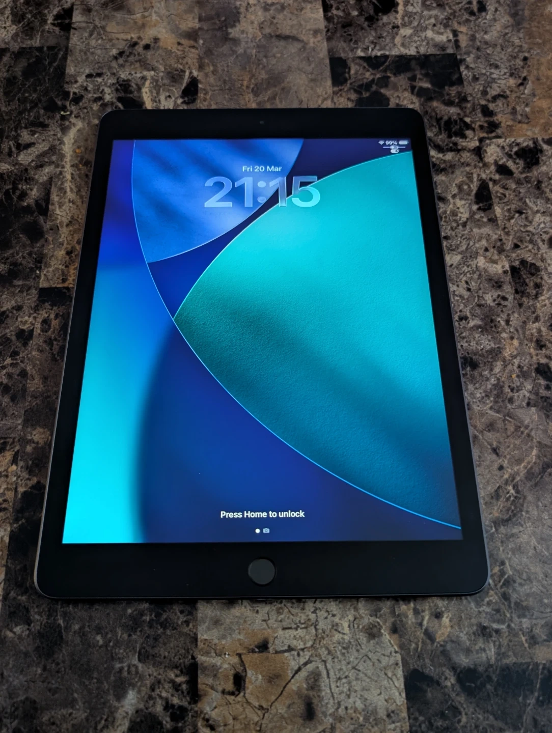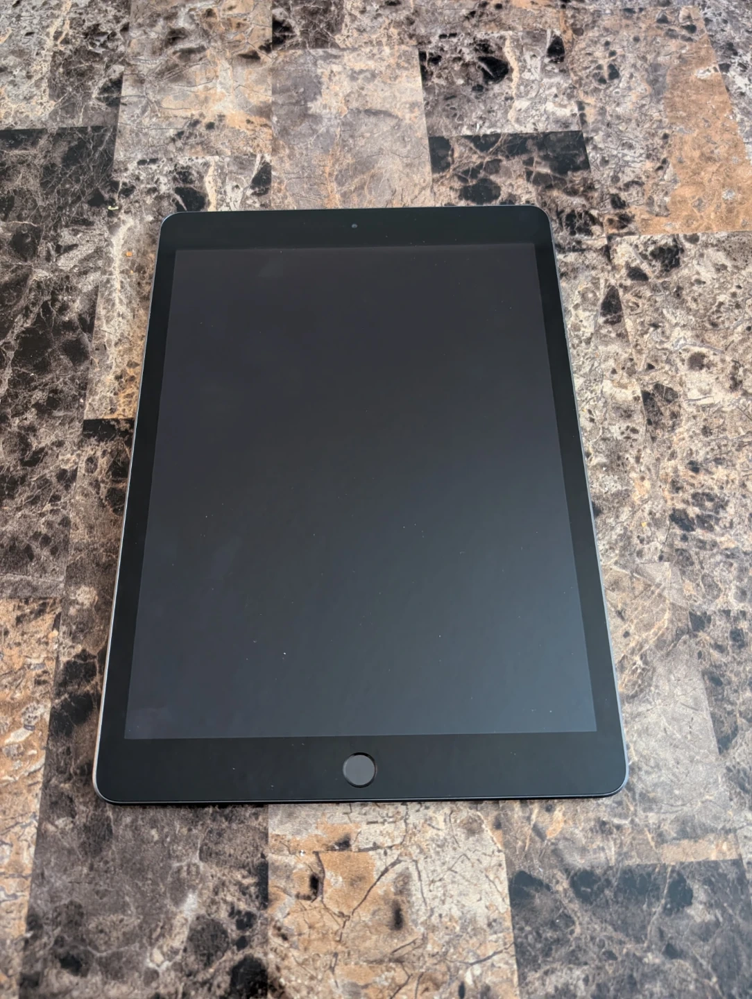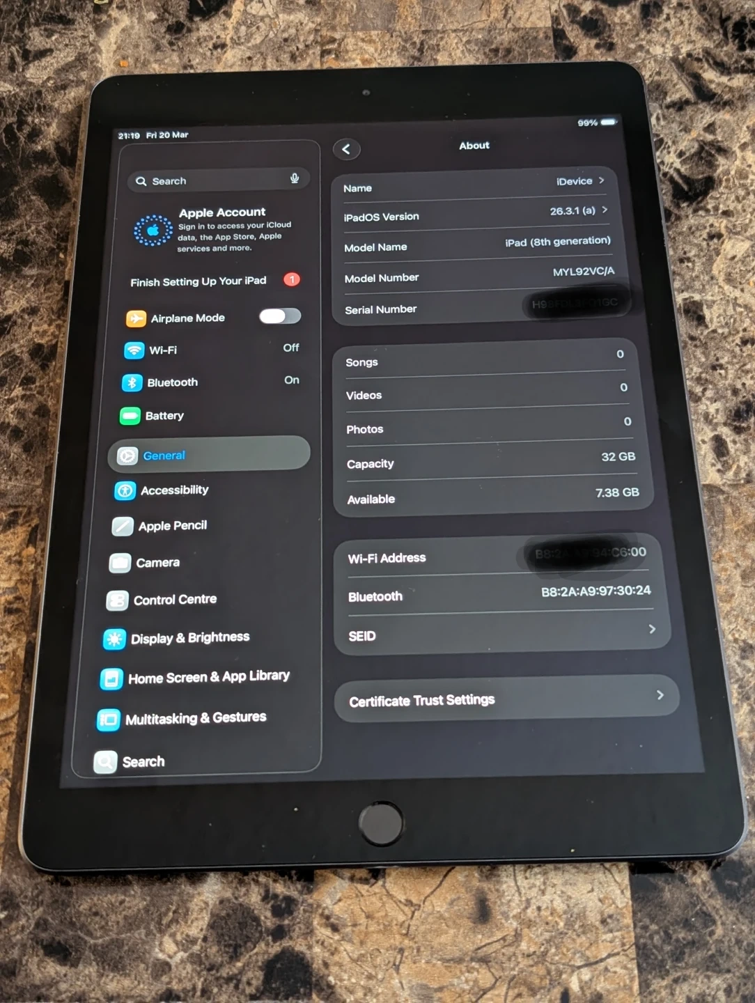 It's an Apple iPad (8th generation) in space grey with 32GB of storage. It runs on iPadOS 26.3.1. This tablet is great for everyday tasks and entertainment!