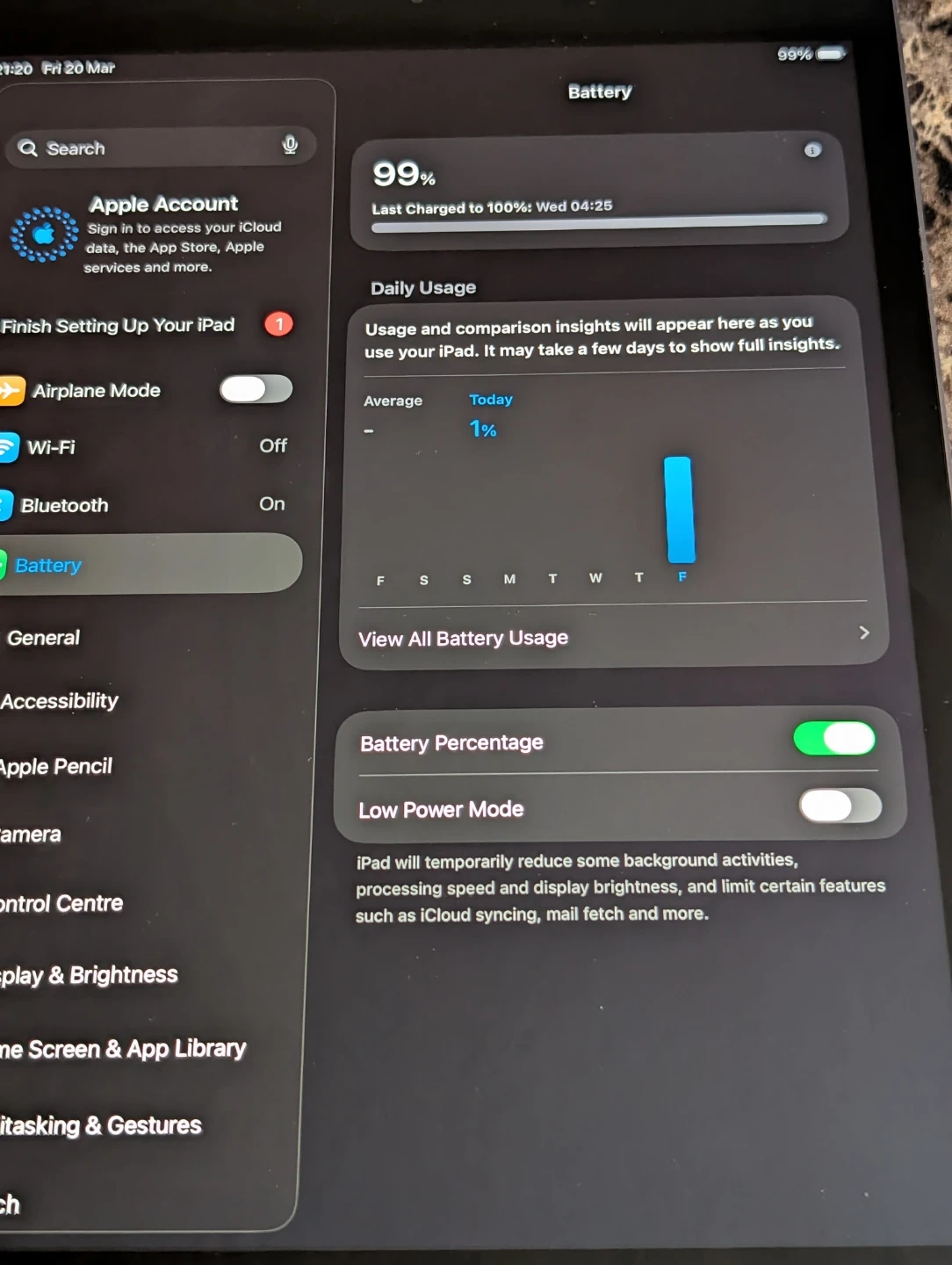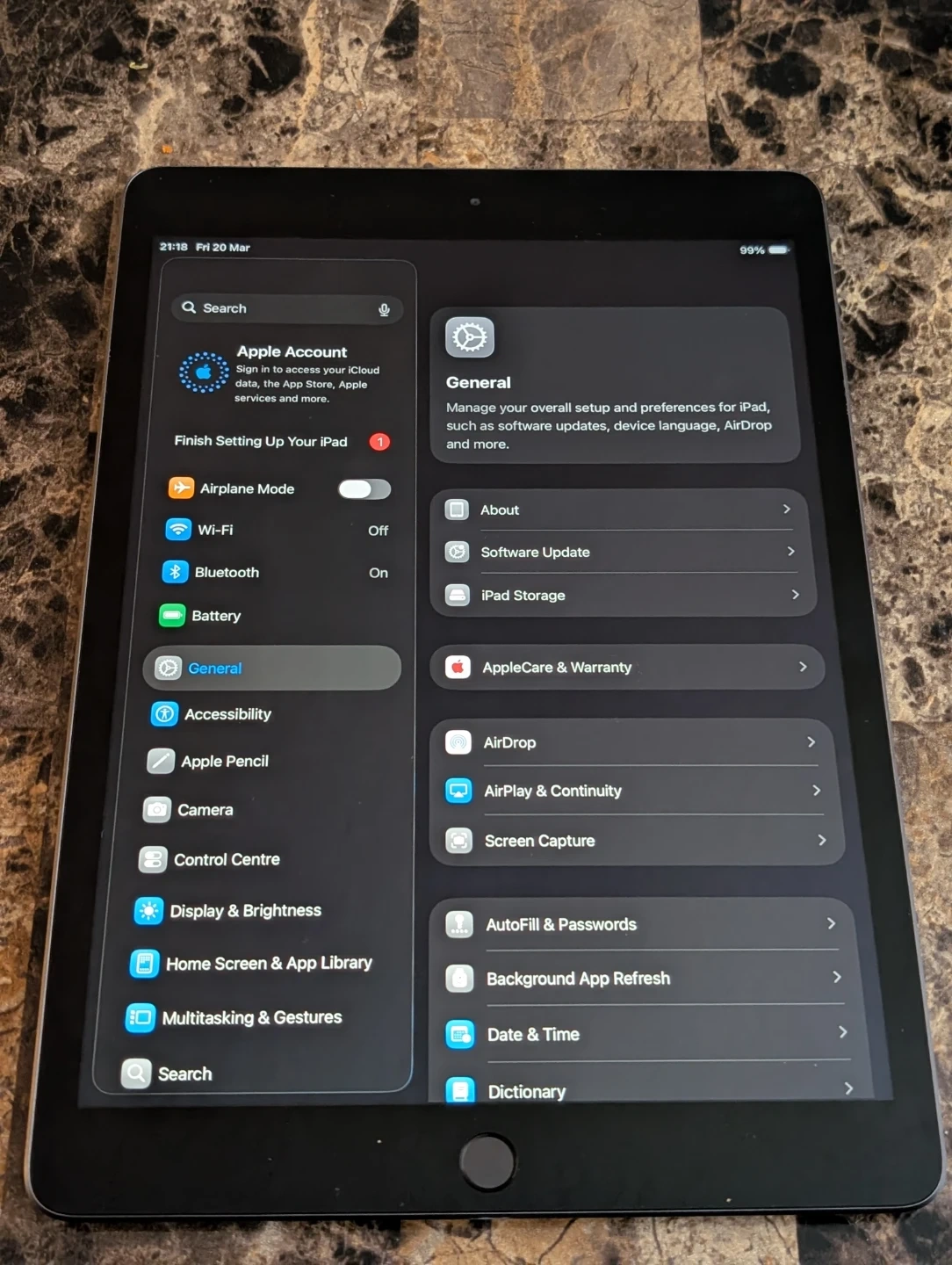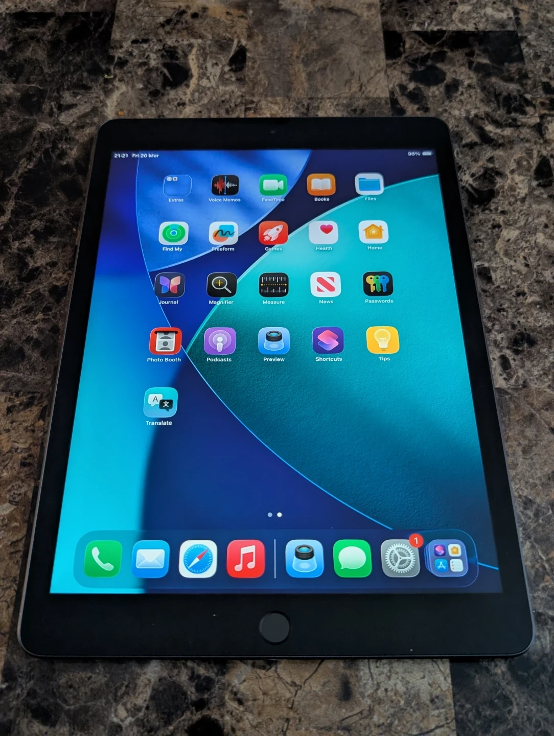 It's an Apple iPad (8th generation) in space grey with 32GB of storage. It runs on iPadOS 26.3.1. This tablet is great for everyday tasks and entertainment!