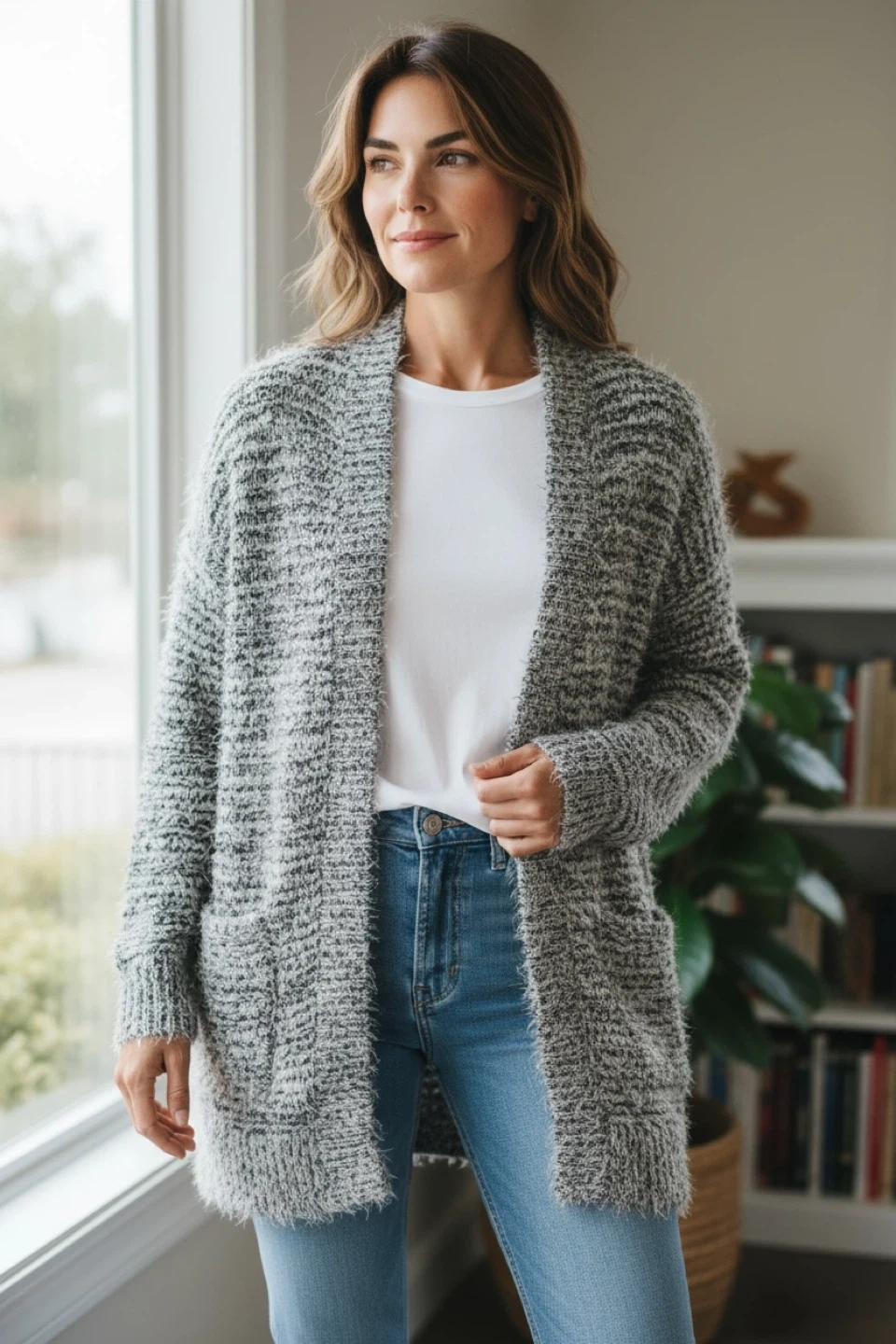Here's a cozy grey knit cardigan! It looks great with jeans or leggings, and is perfect for layering on chilly days.